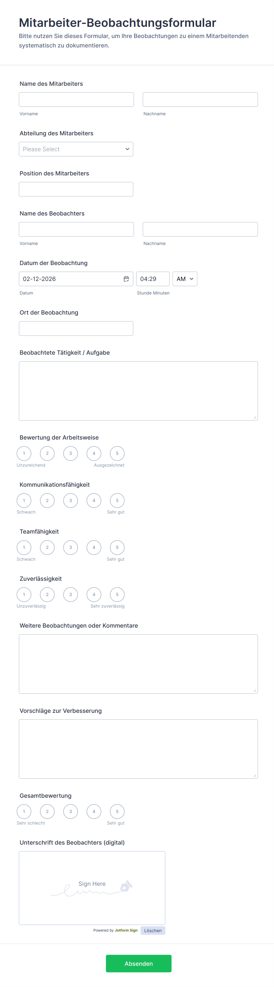 Ein Mitarbeiterbeurteilungsformular ist ein Instrument zur Leistungsbeurteilung, mit dem Sie die Fortschritte Ihrer Mitarbeiter verfolgen können, indem Sie Informationen über ihre Fähigkeiten, Ziele und Leistungen sammeln. Mit unseren kostenlosen Vorlagen für Mitarbeiterbeurteilungsformulare können Sie die Antworten online erfassen, um zu sehen, was Ihre Mitarbeiter gut machen und wo Verbesserungsbedarf besteht. Sobald Sie Ihre Mitarbeiterbeurteilungen auf Ihrem Computer oder mobilen Gerät erstellt haben, werden sie sicher in Ihrem Jotform-Konto gespeichert — so können Sie sie ganz einfach verwalten und in druckbare PDFs umwandeln!