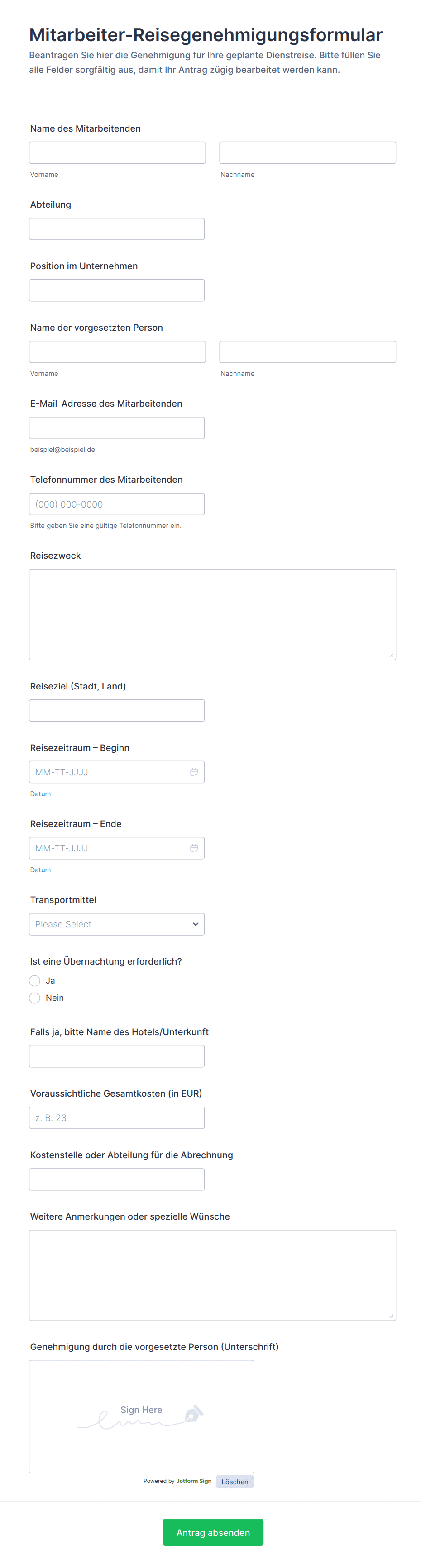 Eine Genehmigungsformularvorlage ist ein vorgefertigtes Online-Formular, das den Prozess der Einreichung, Überprüfung und Genehmigung von Anfragen innerhalb eines Unternehmens erleichtert. Es standardisiert den Workflow und stellt sicher, dass alle erforderlichen Informationen erfasst und an die richtigen Personen weitergeleitet werden.