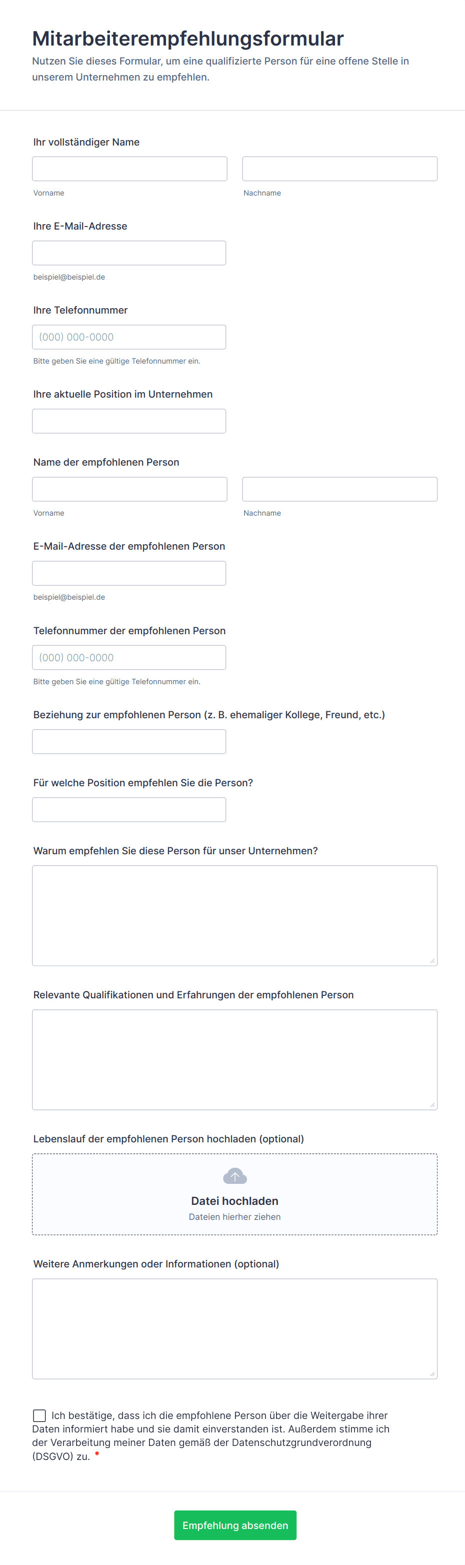 Ein Bewerbungsformular ist ein Formular, das während des Einstellungsprozesses verwendet wird, um Informationen von potenziellen Mitarbeitern zu sammeln. Ob Sie eine Empfangsdame oder eine neue Führungskraft einstellen, verwenden Sie diese kostenlose Vorlage für ein Bewerbungsformular, um die benötigten Informationen zu sammeln! Dank des einfachen Designs können Sie dieses Online-Bewerbungsformular in Sekundenschnelle einbetten oder mit einem Link weiterleiten, um loszulegen. Es ist einfach zu verwenden und sieht auf jedem Gerät gut aus. Möchten Sie Ihre potenziellen neuen Mitarbeiter kennenlernen, bevor Sie sie einstellen? Fügen Sie Ihrem Bewerbungsformular über den Formulargenerator ganz einfach Fragen hinzu oder ordnen Sie die Fragen neu an, um die benötigten Informationen zu erhalten. Sie können sogar Informationen über Gehaltsvorstellungen und betriebliche Leistungen, Fähigkeiten und Erfahrung abfragen. Durch die Annahme von Online-Bewerbungen können Sie den Einstellungsprozess optimieren und die benötigten Informationen über potenzielle Mitarbeiter erhalten - und das alles in nur wenigen Minuten. Stellen Sie sicher, dass Sie die besten Mitarbeiter für Ihr Unternehmen einstellen, indem Sie ein kostenloses Bewerbungsformular ausfüllen!