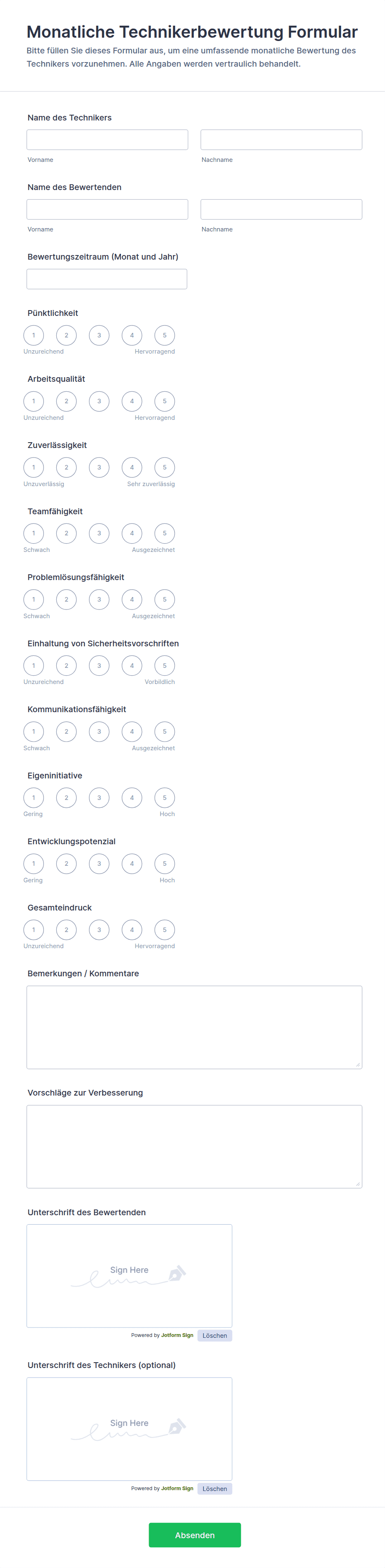 Erfassen Sie monatliche Leistungsbewertungen von Technikern mit Jotform, um Beurteilungen im Team einheitlich zu dokumentieren und für Gespräche, Entwicklung und Planung einfach verfügbar zu machen.