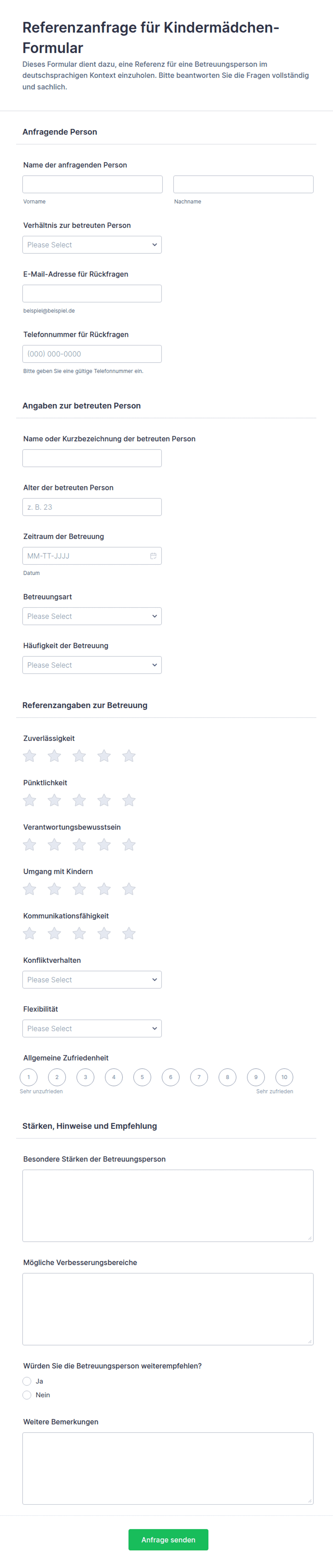 - Professionelle Referenzformulare erfassen die Arbeitsbeziehung, den Rollenkontext, Leistungsfeedback, Stärken, Zuverlässigkeit und die Eignung für die Rolle.