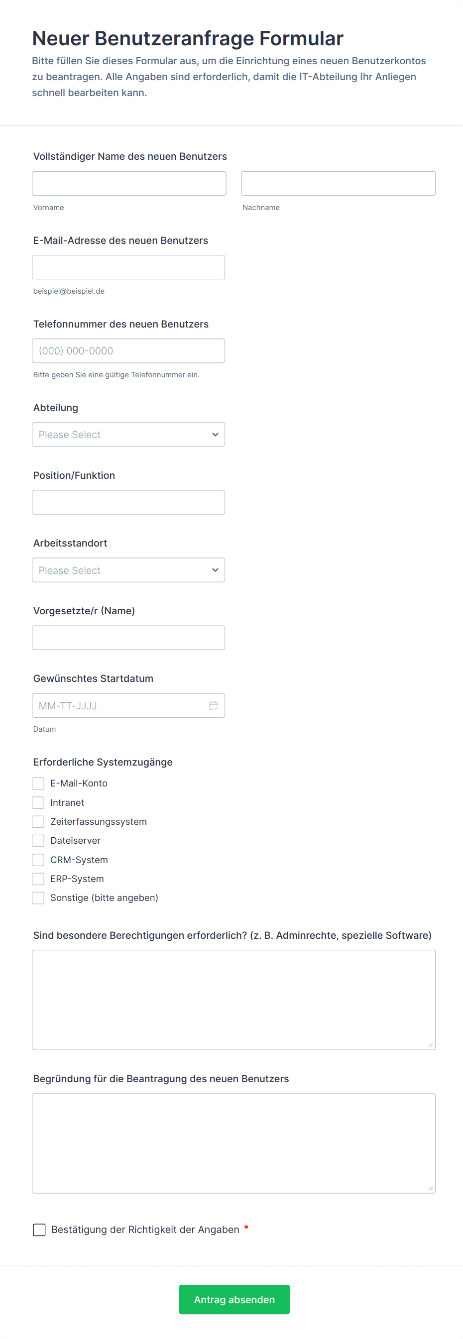 - Formulare für Systemzugriff und Berechtigungen legen den Schwerpunkt auf angeforderte Anwendungen, rollenbasierte Zugriffsebenen, Begründung, erforderliche Schulungen oder Richtlinienbestätigungen sowie IT-Genehmigungsweiterleitung.