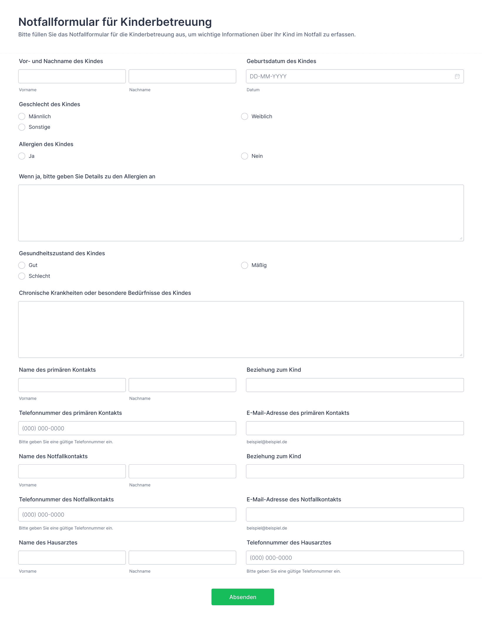 Ein Gesundheitsfragebogen wird von Ärzten und medizinischem Fachpersonal verwendet, um wichtige Gesundheitsinformationen von ihren Patienten zu sammeln. Dieser kostenlose Online-Gesundheitsfragebogen ist ideal für die Telemedizin und ermöglicht es Ihnen, die Kontaktdaten des Patienten, seine Krankengeschichte und Dokumente oder Fotos online zu erfassen. Alle Eingaben werden sicher in Ihrem Jotform-Konto gespeichert und können auf jedem beliebigen Gerät angezeigt, bearbeitet oder mit anderen medizinischen Fachkräften geteilt werden - oder mit unseren über 100 kostenlosen Formularintegrationen automatisch mit Ihrer bevorzugten Software synchronisiert werden. Wenn Sie Fragen zu diesem kostenlosen Online-Gesundheitsfragebogen hinzufügen oder löschen möchten, verwenden Sie unseren Drag & Drop-Formulargenerator, um die Vorlage mit nur wenigen Klicks anzupassen. Sie können sogar Ihr Logo hinzufügen und Schriftarten und Farben ändern, um ein individuelles Design zu erhalten! Und vergessen Sie nicht, ein Upgrade vorzunehmen, um die Daten Ihrer Patienten mit HIPAA-freundlichen Funktionen zu schützen. Mit einem Online-Gesundheitsfragebogen, der wichtige medizinische Daten erfasst und manuelle Prozesse für Sie erledigt, können Sie weniger Zeit mit Papierkram und mehr Zeit mit der Betreuung Ihrer Patienten verbringen.