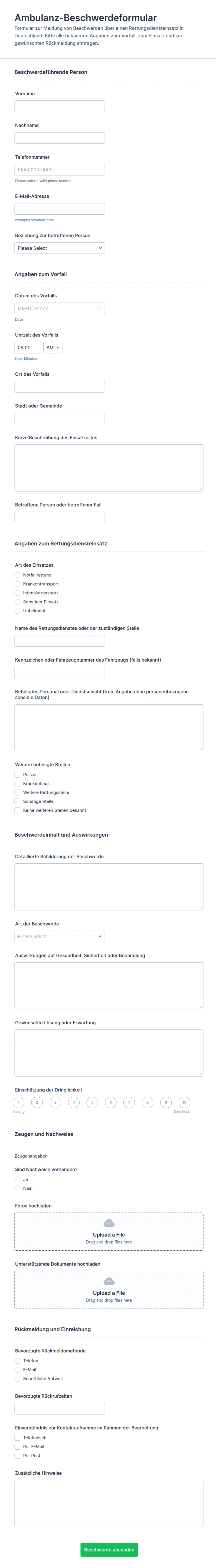 - Bedingte Logik: Bestimmte Felder werden nur angezeigt, wenn bestimmte Optionen ausgewählt werden (z. B. Art der Beschwerde).