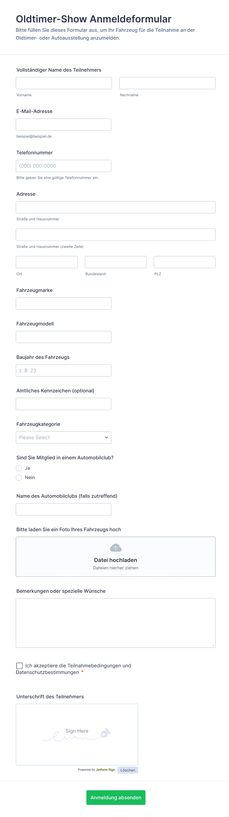 Veranstaltungsanmeldeformulare sind digitale Tools, die den Prozess der Erfassung von Teilnehmerinformationen für eine Vielzahl von Veranstaltungen wie Konferenzen, Workshops, Webinare, Fundraiser, Kurse und gesellschaftliche Veranstaltungen optimieren. Mit diesen Formularen können Organisatoren wichtige Details wie Namen der Teilnehmer, Kontaktinformationen, Zahlungspräferenzen, Ernährungsbeschränkungen und Sitzungsauswahl erfassen. Mithilfe von Veranstaltungsanmeldeformularen können Veranstaltungsplaner Teilnahmeinformationen effizient verwalten, die Anwesenheit verfolgen und einen reibungslosen Check-in-Prozess am Tag der Veranstaltung gewährleisten. Dank ihrer Flexibilität eignen sich diese Formulare sowohl für kleine private Zusammenkünfte als auch für große öffentliche Veranstaltungen und lassen sich an die individuellen Anforderungen jedes Anlasses anpassen.