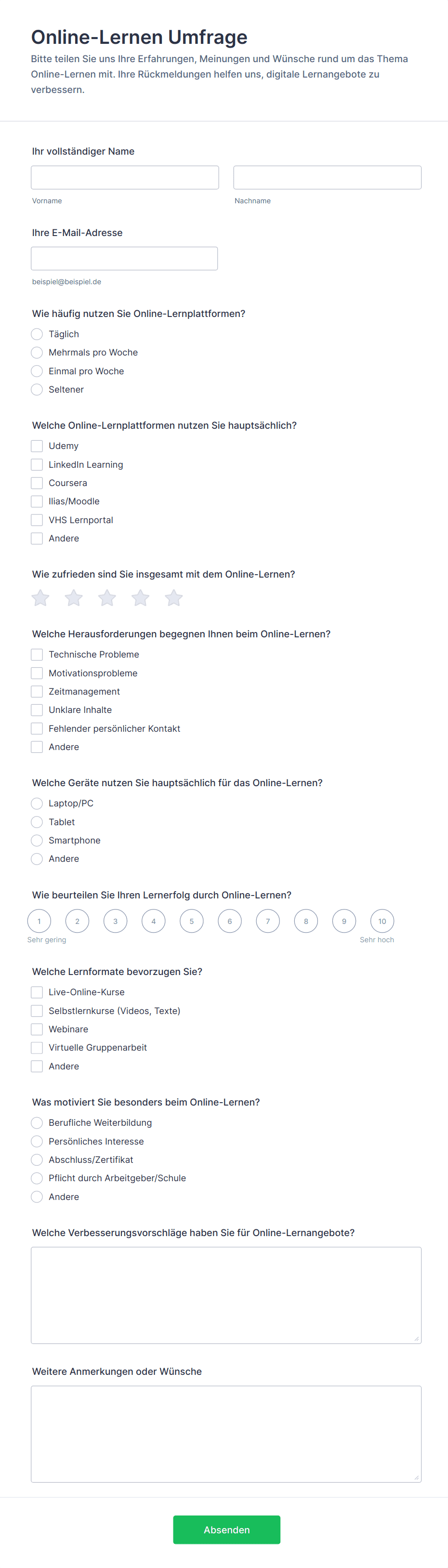 - Für Elternumfragen: Fügen Sie Zufriedenheitsbewertungen, Feedback zur Kommunikation und Verbesserungsvorschläge hinzu.