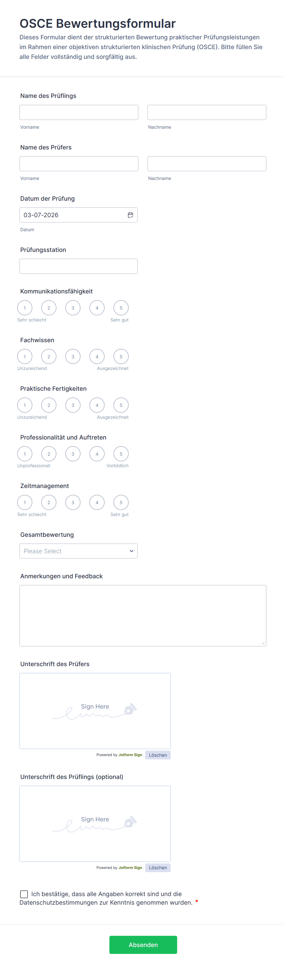 Bewertungsformulare können je nach Zweck persönliche Angaben, Multiple-Choice- oder offene Fragen, Bewertungsskalen, Kommentarfelder und manchmal auch automatisierte Bewertungs- oder Feedbackfelder enthalten.