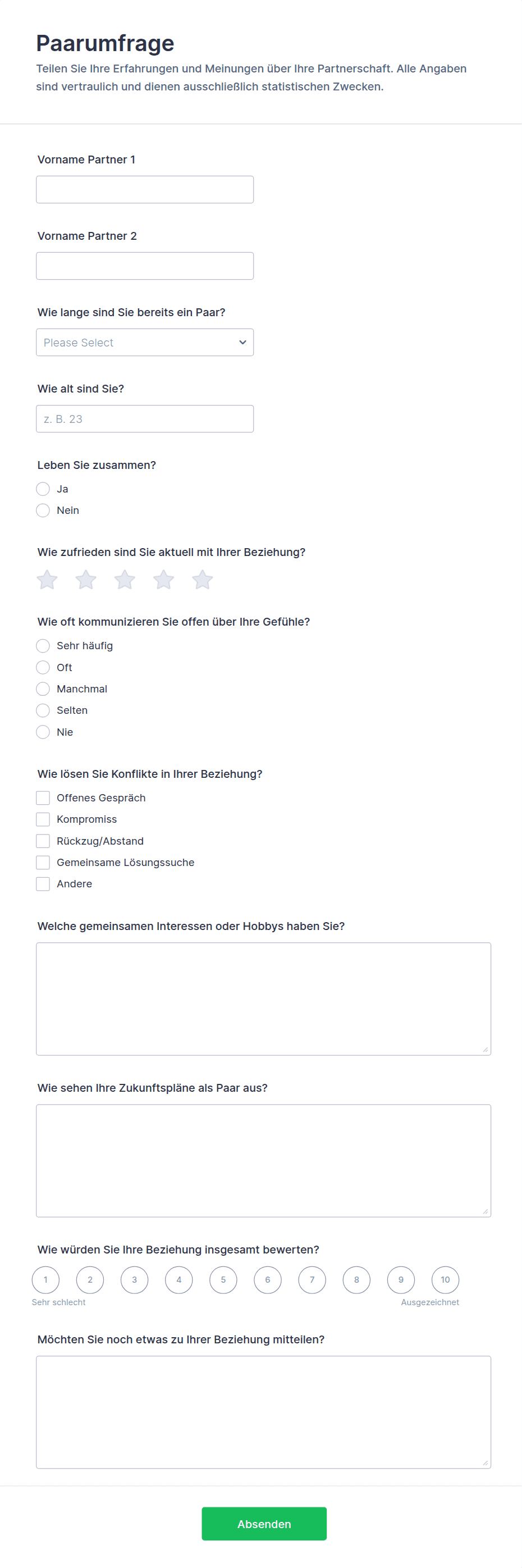 • Paarumfragen: Können Fragen zu Intimität, Vertrauen und gemeinsamen Zielen enthalten.