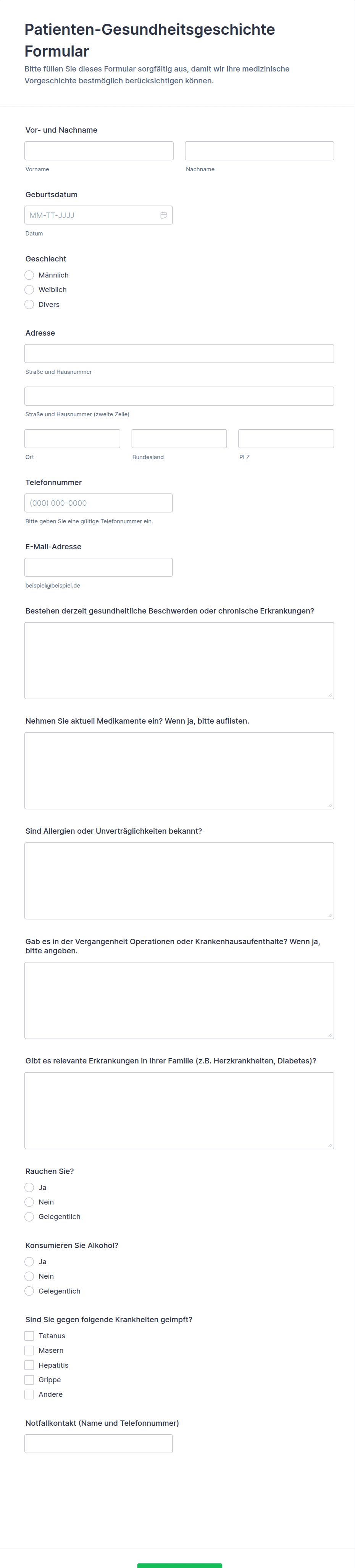 • Für Gesundheitsrisikobewertungen sollten Checkboxen oder Multiple-Choice-Fragen zu Lebensstil, Familienvorgeschichte und spezifischen Risikofaktoren enthalten sein.