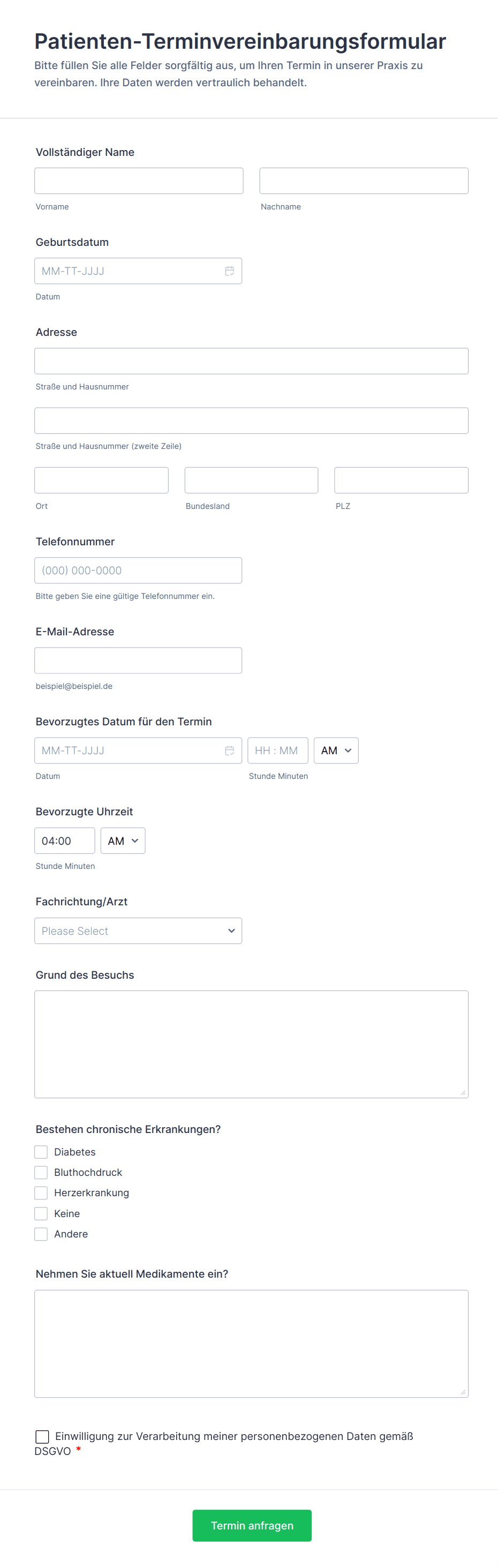 - Medizinische Termine: Erfordern möglicherweise Felder für Versicherungsinformationen, Besuchsgrund und Krankenakte.