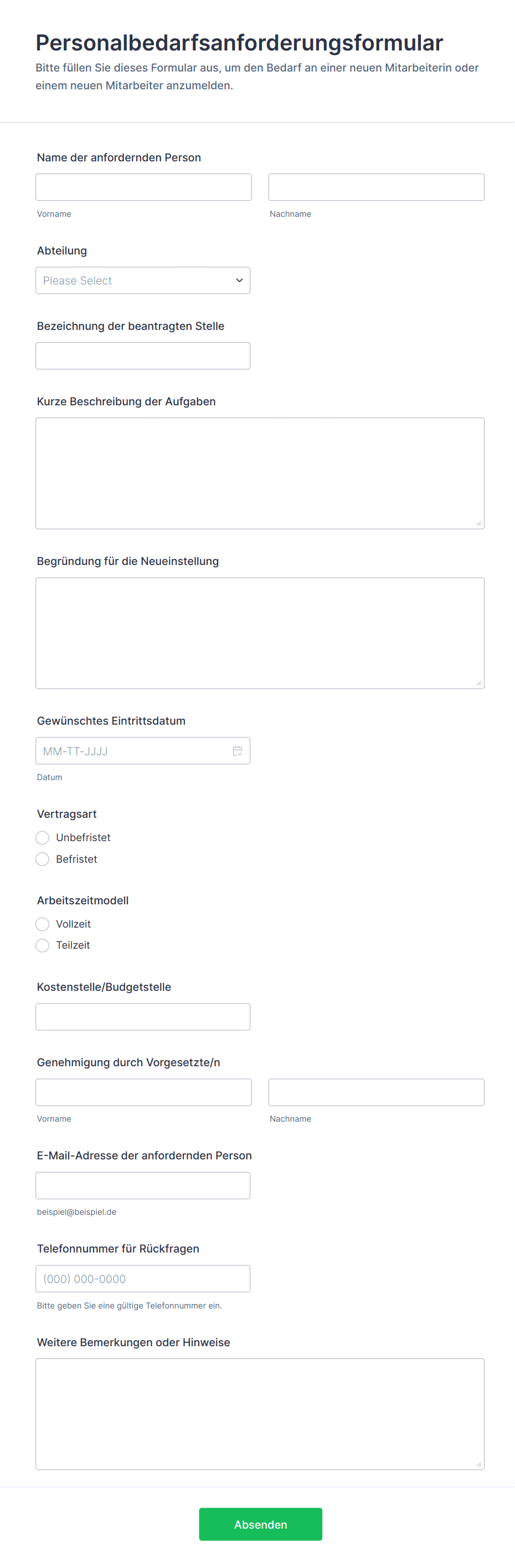 Ein Personalanforderungsformular wird von Unternehmen verwendet, um die Anzahl der Mitarbeiter anzugeben, die sie einstellen müssen. Es wird auch verwendet, um eine Liste der Mitarbeiter und ihrer aktuellen Standorte zu erstellen. In der Personalabteilung ist es nützlich, um Mitarbeiter zu finden, die für eine bestimmte Aufgabe benötigt werden. Ganz gleich, ob Sie ein Personalleiter, der Personalchef eines Unternehmens oder der Leiter der Personalabteilung sind, verwenden Sie dieses Personalanforderungsformular, um Bewerberinformationen zu erfassen und zu überwachen. Geben Sie die Anzahl der verfügbaren Stellen und die Qualifikationen der einzelnen Bewerber ein und geben Sie das Formular dann an potenzielle Mitarbeiter weiter - sie können es ausfüllen, wo immer sie sind! Sie können das Formular sogar anpassen, indem Sie Ihr Logo hinzufügen, die Farben ändern oder ein Thema wählen, das zu Ihrer Marke passt. Und wenn Sie die Antworten in Ihrem CRM oder einem Cloud-Speicherdienst Ihrer Wahl speichern möchten, nutzen Sie die leistungsstarken Integrationen von Jotform. Sie können sogar die Aktivität von Bewerbern verfolgen oder neue Bewerber über dieses Formular hinzufügen!