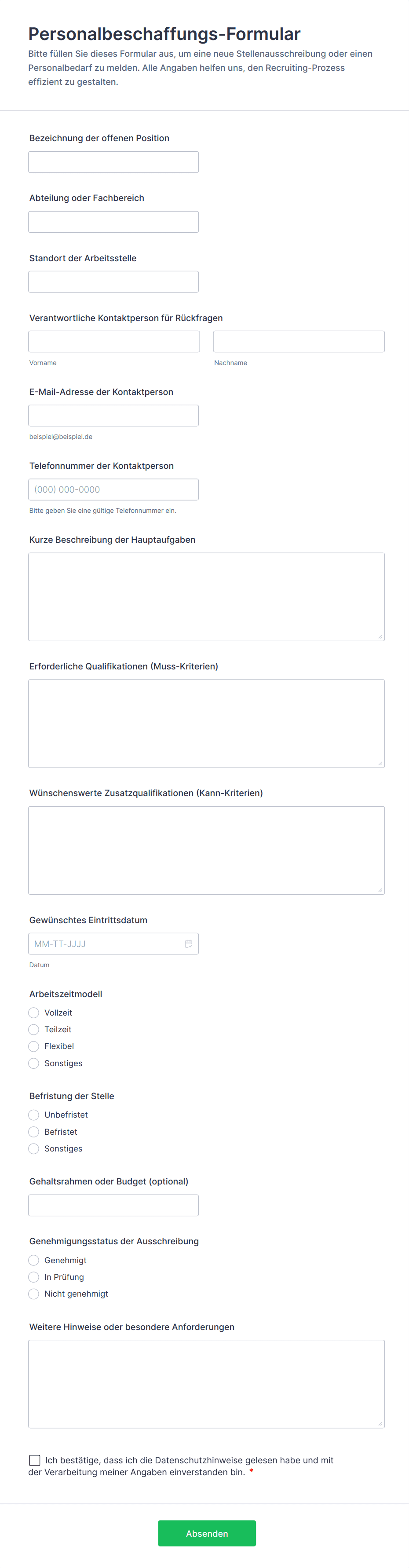 Ein Stellengesuch wird von Unternehmen und Organisationen für die Suche nach einem neuen Mitarbeiter verwendet. Notieren Sie Ihre Einstellungsanforderungen mit Hilfe eines Online-Stellengesuchsformulars - und teilen Sie es dann mit einem Link oder betten Sie es in Ihre Website ein! Sie können dieses Formular für Stellengesuche verwenden, um einen neuen Mitarbeiter für eine Einstiegsposition oder eine hochrangige Position zu finden. Das Formular enthält bereits vorgefertigte Felder für Gehalt, Stellenbezeichnung und Anforderungen an die Position, so dass Sie es an die zu besetzende Stelle anpassen können. Unsere Vorlage für ein Stellengesuch kann Teil Ihres Bewerbungsprozesses sein - passen Sie das Formular einfach an die Stelle an, die Sie besetzen möchten. Wenn Sie Qualifikationen hinzufügen, einen Lebenslauf hochladen oder sogar ein Online-Quiz ausfüllen möchten, können Sie dies mit unserem Formulargenerator tun. Behalten Sie den Überblick über Ihre Suche, indem Sie jedes Gesuch als "angenommen", "abgelehnt" oder "ausstehend" markieren, damit Sie wissen, woran Sie sind. Wenn Sie Antworten automatisch an andere Konten senden möchten - z.B. an eine Speichersoftware - können Sie das mit den über 100 Integrationen von Jotform tun.