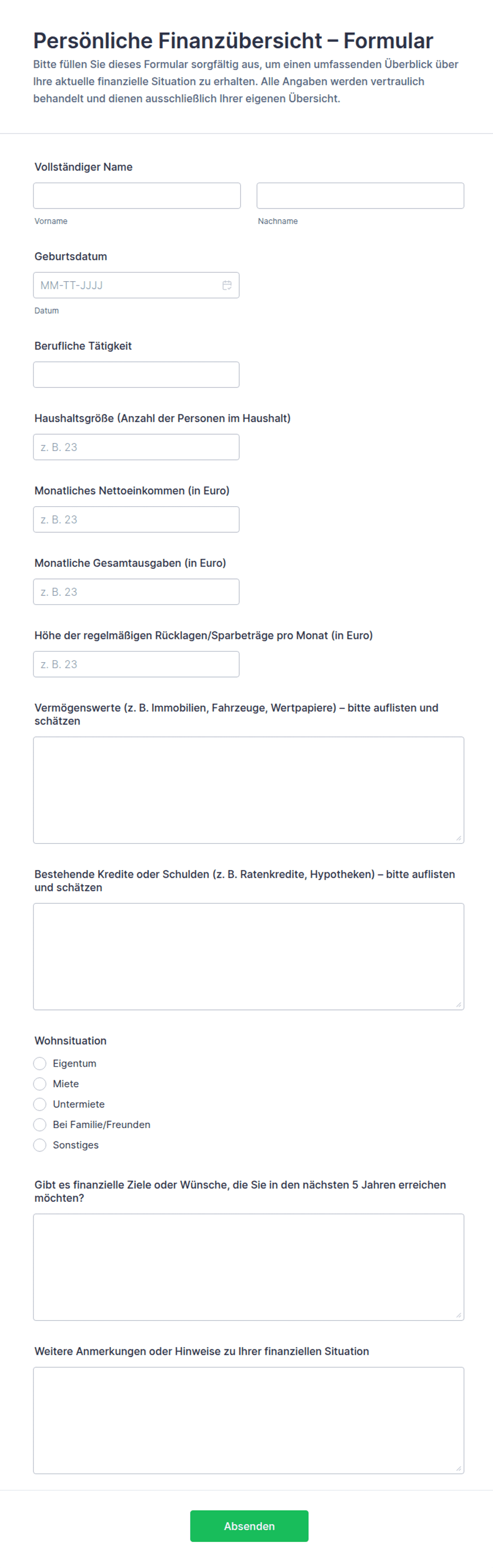 Persönliche Finanzübersicht Fragebogen