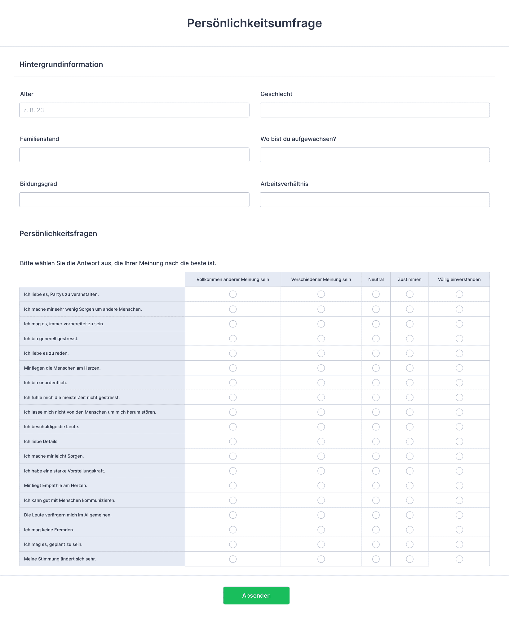 • Inhalt und Felder: Eine Kundenzufriedenheitsumfrage konzentriert sich möglicherweise auf Bewertungsskalen und offene Feedback-Fragen, während eine Marktforschungsumfrage demografische Fragen und Multiple-Choice-Optionen enthalten könnte. Mitarbeiterbefragungen erfordern oft Anonymität und verwenden häufig Likert-Skalen, während Veranstaltungsfeedback-Formulare Fragen zur Logistik und Qualität der Redner beinhalten könnten.