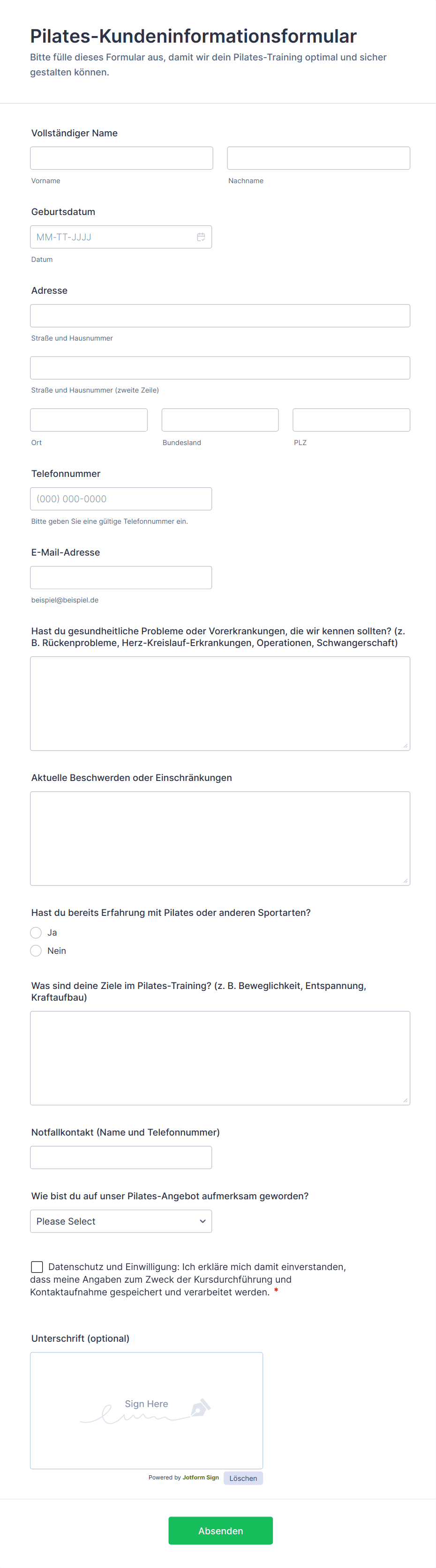 Zu den üblichen Feldern gehören Kontaktdaten, Gesundheitszustand und Patientenakte, Fitness- oder Trainingsziele, Verfügbarkeit, Notfallkontakte sowie Einwilligungs- oder Haftungsausschluss.