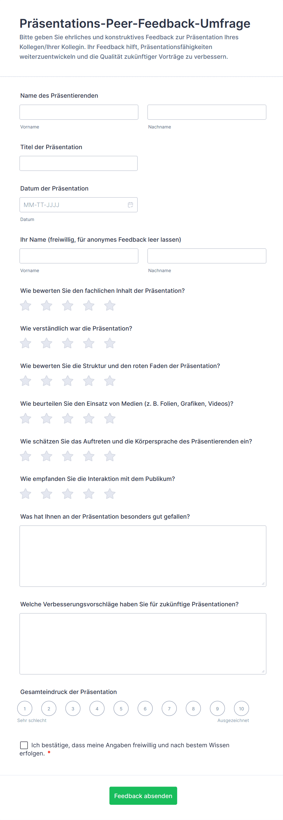- Bildungsumfeld: Lehrkräfte und Professoren nutzen Peer Feedbackformulare, um Studierende dazu anzuregen, die Arbeit ihrer Kommilitonen zu bewerten, und fördern so kritisches Denken und kollaboratives Lernen. Diese Formulare können sich auf Gruppenprojekte, Präsentationen oder schriftliche Aufgaben konzentrieren.