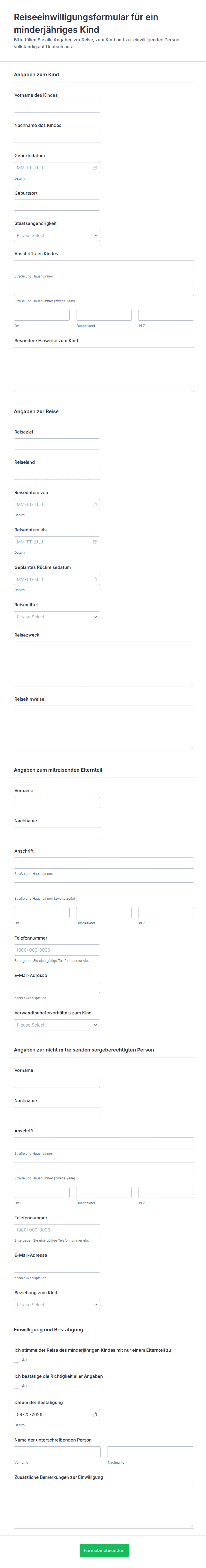Einverständniserklärungen für Reisen sind rechtliche Dokumente, die Minderjährigen oder unterhaltsberechtigten Personen die Erlaubnis erteilen, im In- oder Ausland zu reisen — oft auch ohne Anwesenheit eines oder beider Elternteile bzw. Erziehungsberechtigter. Diese Formulare sind unerlässlich, um sicherzustellen, dass Kinder oder unterhaltsberechtigte Personen sicher und legal reisen können — sei es für Schulausflüge, Familienurlaube, Gruppenreisen oder medizinische Notfälle. In der Regel enthalten sie Angaben zum Reisenden, zur begleitenden erwachsenen Person (falls vorhanden), zu den Reisedaten, den Reisezielen und zu Notfallkontaktdaten. Unter Umständen müssen sie notariell beglaubigt sein, damit sie von Fluggesellschaften, Grenzbehörden oder anderen Organisationen akzeptiert werden.