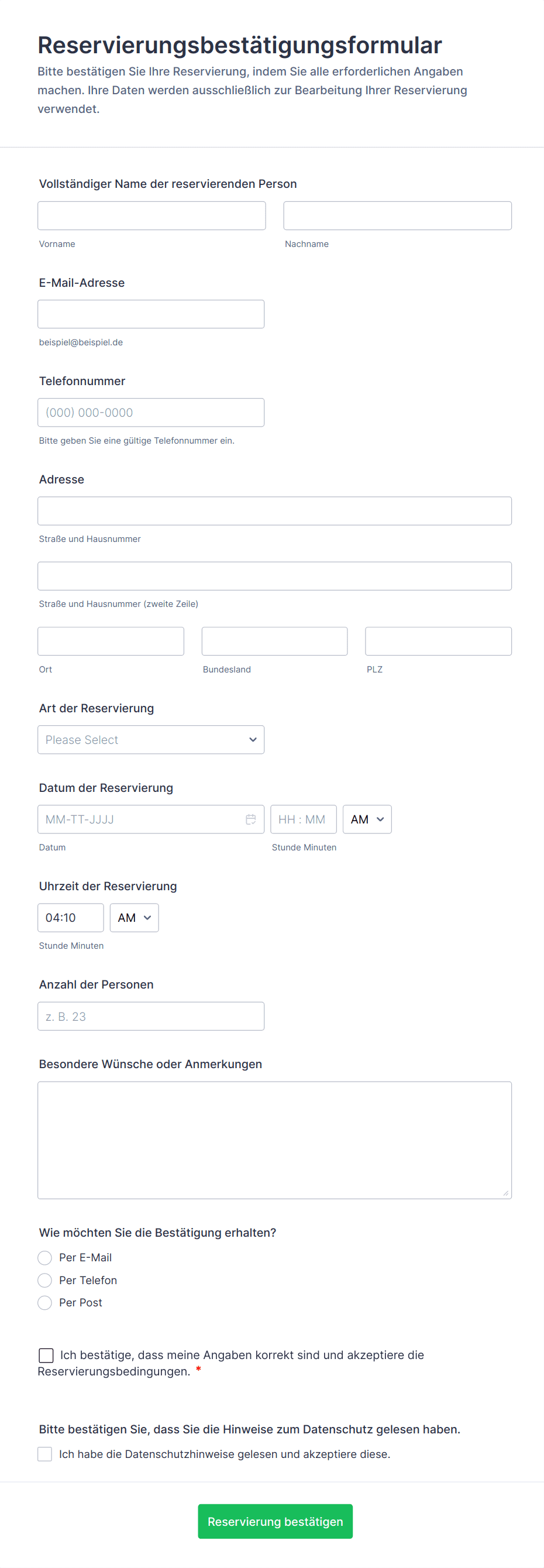 - Somit lassen sich Reservierungsformulare an jedes Buchungsszenario anpassen, wobei Inhalt und Felder so angepasst werden können, dass sie die für den jeweiligen Anwendungsfall erforderlichen spezifischen Informationen erfassen.