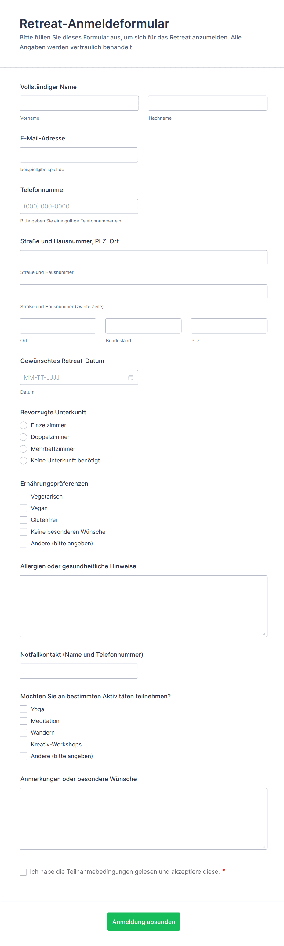 Zu den üblichen Angaben gehören der Name des Teilnehmers, die E-Mail-Adresse, die Telefonnummer, Zahlungsdetails (falls zutreffend), die Auswahl der Sitzung oder Aktivität, Ernährungsbeschränkungen sowie besondere Unterbringungswünsche.