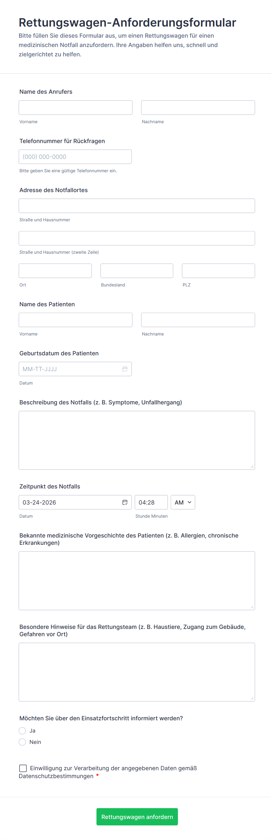 Ein Notfallberichtsformular erfasst wichtige Details zu einem Vorfall — etwa Unfälle, Verletzungen und Sicherheitsverstöße. So gewährleisten Sie eine präzise Dokumentation und ermöglichen eine schnelle Reaktion.