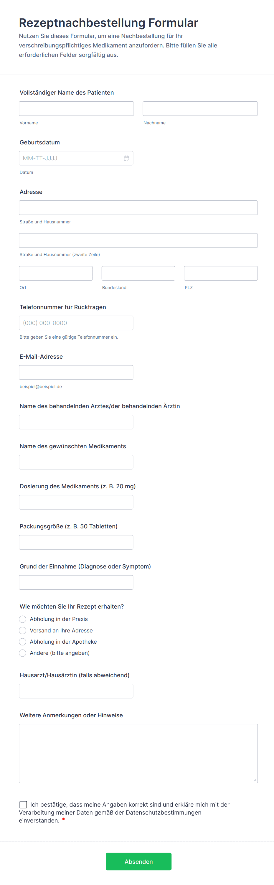 Ein Apothekenformular ist ein digitales Dokument, das von Apotheken verwendet wird, um Informationen zu Rezepten, Patientenaufnahmen, Medikamentenbestellungen und anderen Apothekendienstleistungen zu erfassen, zu verwalten und zu verarbeiten.