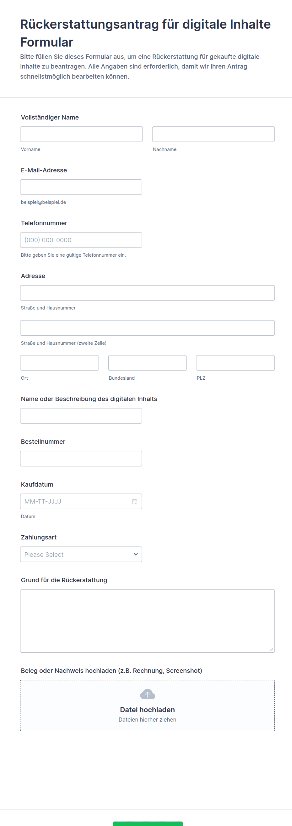 Zu den üblichen Feldern gehören Kundenkontaktdaten, Bestell- oder Transaktionsnummer, Produkt- oder Serviceinformationen, Grund für die Rückerstattung, Kaufdatum und unterstützende Dokumente wie Quittungen oder Fotos.