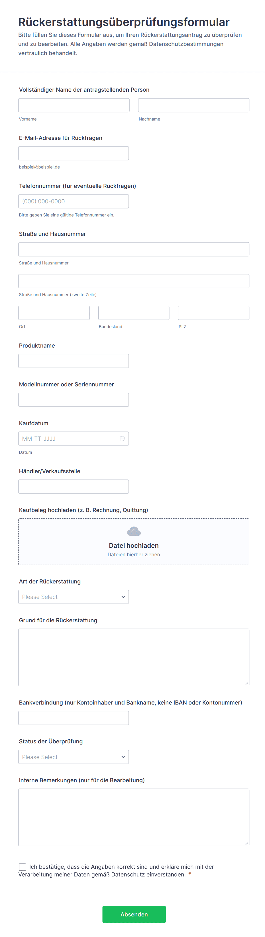Zu den üblichen Feldern gehören Kundenkontaktdaten, Bestell- oder Transaktionsnummer, Produkt- oder Serviceinformationen, Grund für die Rückerstattung, Kaufdatum und unterstützende Dokumente wie Quittungen oder Fotos.