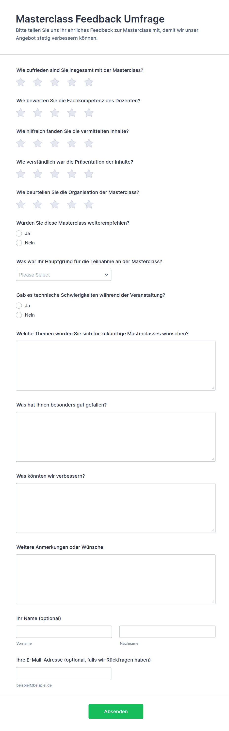 Feedback-Umfragen sind strukturierte Tools, mit denen Sie Meinungen, Erkenntnisse und Bewertungen zu Produkten, Dienstleistungen, Veranstaltungen oder Erlebnissen sammeln. Organisationen, Unternehmen, Bildungseinrichtungen und Veranstaltungsplaner nutzen sie, um Zufriedenheit zu messen, Verbesserungsmöglichkeiten zu erkennen und datenbasierte Entscheidungen zu treffen. Sie passen die Umfragen an verschiedene Szenarien an — etwa Feedback nach dem Kauf, Mitarbeitendenbindung, Kursbewertungen, Kundenservice-Bewertungen oder Follow-ups nach Events. Durch direkte Rückmeldungen von Interessengruppen erfahren Sie, was gut funktioniert und wo Handlungsbedarf besteht.