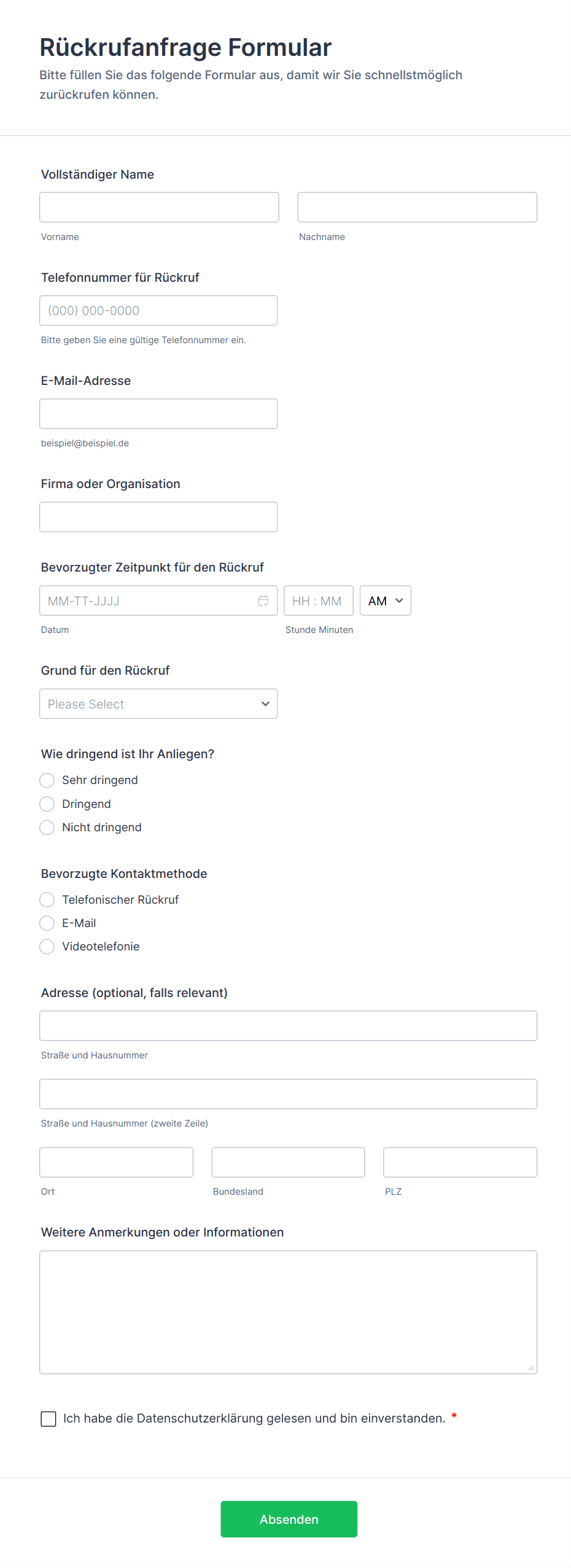 • Ein allgemeines Kontaktformular benötigt möglicherweise nur grundlegende Felder (Name, E-Mail, Nachricht).