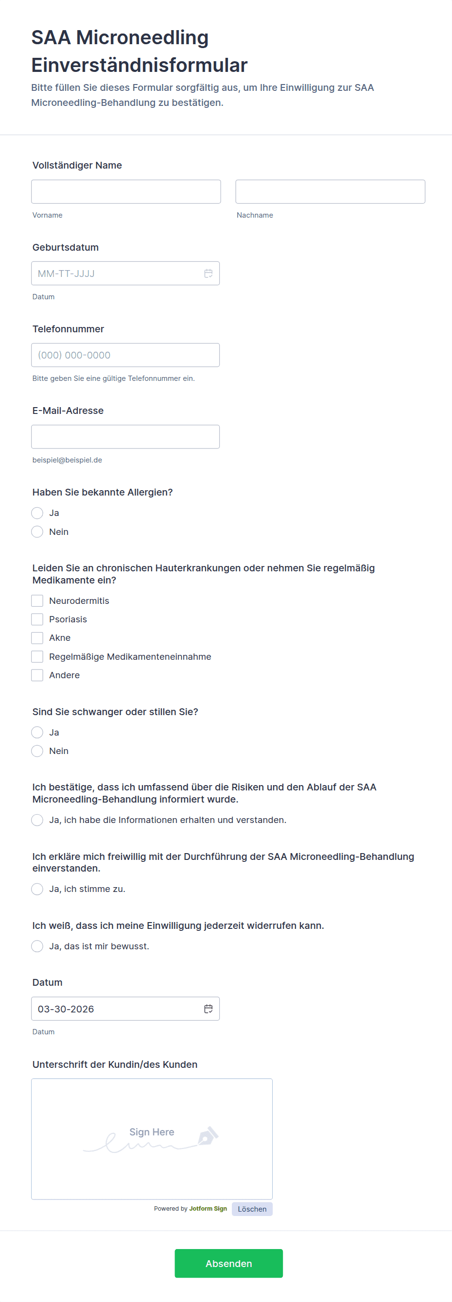Mit Jotform erstellen und verwalten Sie Einverständniserklärungen mühelos. Gestalten Sie mit dem No-Code-Formulargenerator individuelle Erklärungen für Patientenaufnahme, elterliche Einwilligungen oder Datenverarbeitungsvereinbarungen. Die Drag-and-Drop-Oberfläche, anpassbare Vorlagen und Integrationen mit sicheren Speicher- und Benachrichtigungssystemen ermöglichen Ihnen, Einwilligungsantworten einfach zu erfassen, zu organisieren und abzurufen. Nutzen Sie erweiterte Funktionen, um Compliance sicherzustellen, Workflows zu optimieren und Unternehmen sowie Befragten ein professionelles Erlebnis zu bieten.