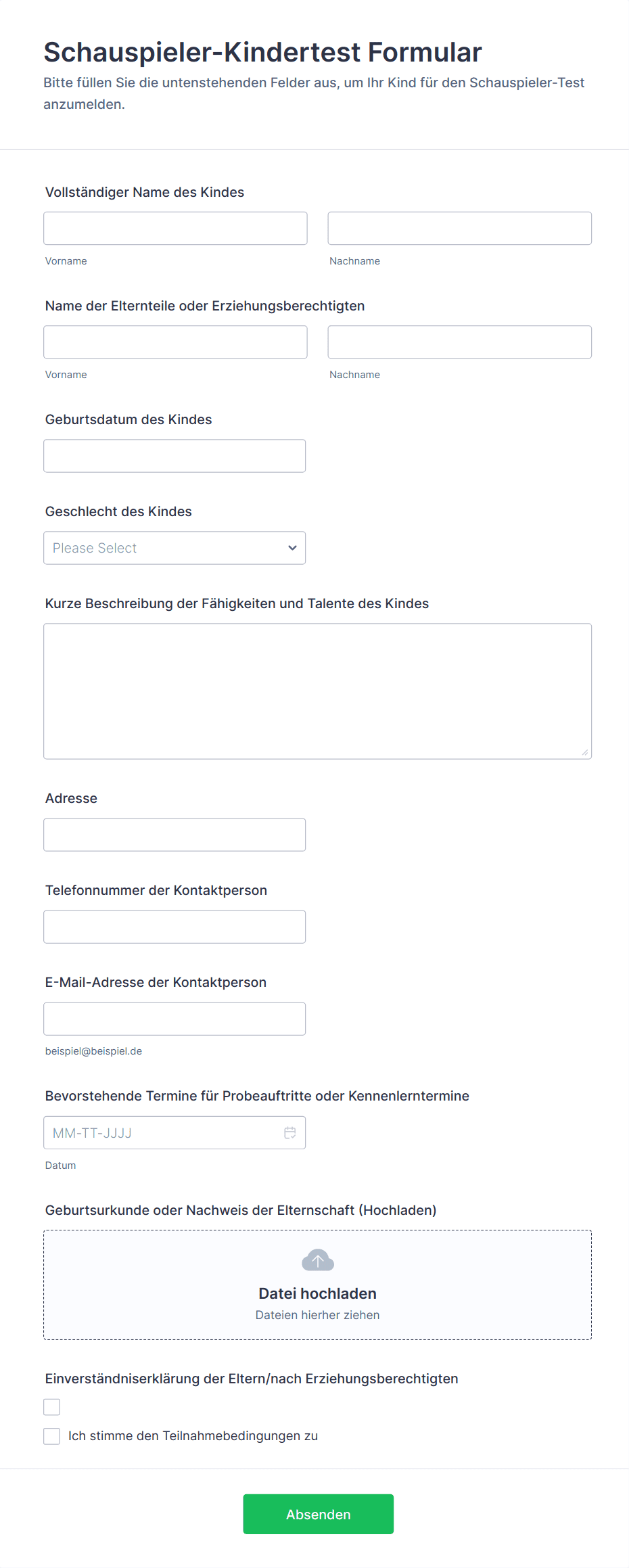 2) Was sollte in einem Schauspieler-Kindertest-Formular enthalten sein?