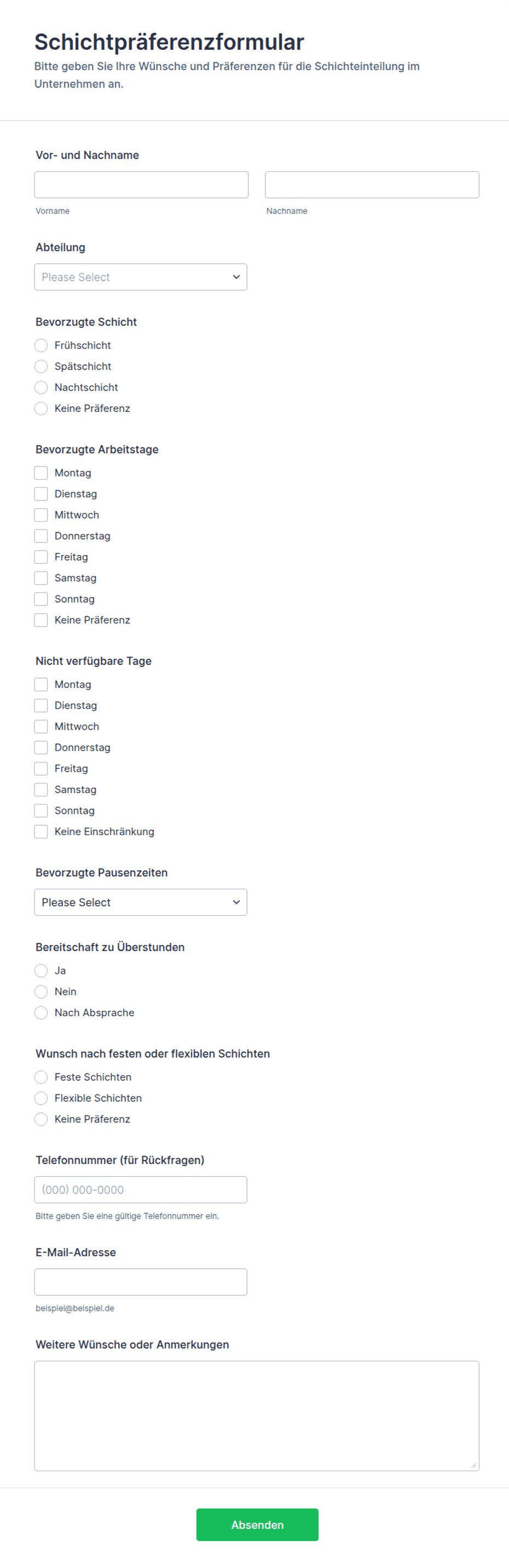 Ja, Personalformulare können Onboarding-Formulare, Urlaubsanträge, Zeiterfassungsformulare, Leistungsbewertungen, Vorfallsmeldungen, Schulungsanmeldungen und Feedbackbögen umfassen, die jeweils auf spezifische HR-Anforderungen zugeschnitten sind.