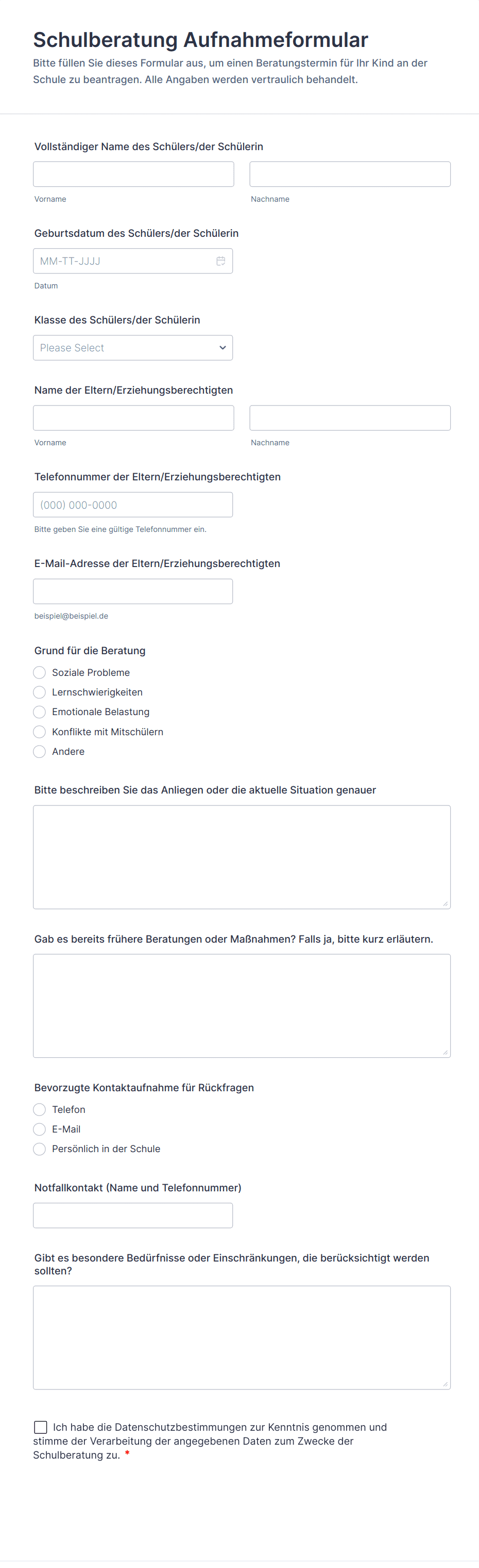 Machen Sie Schluss mit Papier und beginnen Sie mit der sicheren Erfassung von Patientendaten mit den leistungsstarken Formularen für Betreuer von Jotform. Patienten können von jedem Gerät aus Dinge wie Verhaltensbewertungen, Beratungsverträge und Einverständniserklärungen ausfüllen. Mit unserem intuitiven Formulargenerator können Sie jede dieser Vorlagen in Sekundenschnelle und ohne Programmierkenntnisse vollständig anpassen. Per Drag & Drop können Sie das Branding Ihrer Praxis hochladen, E-Signatur-Formulare hinzufügen, Schriftarten und Farben auswählen, Widgets und Integrationen installieren und vieles mehr. Fügen Sie den Link zum Formular in Begrüßungs-E-Mails ein oder lassen Sie Ihre Patienten das Formular auf einem Tablet in Ihrem Büro ausfüllen. Erstellen Sie mit diesen kostenlosen Beratungsformularen sichere Online-Patientenformulare, die überall ausgefüllt werden können.