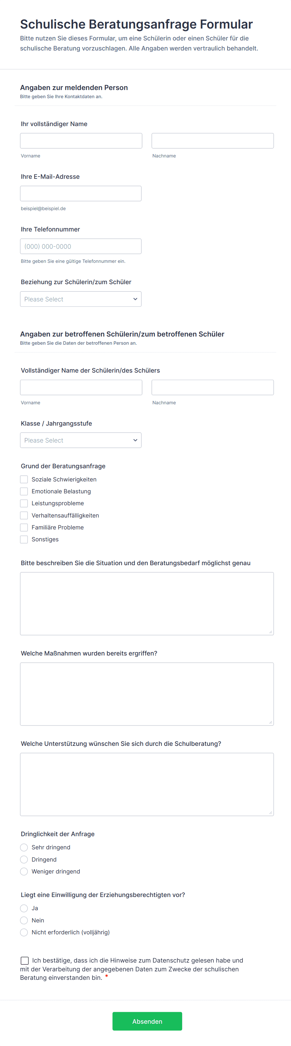 Ein Formular für Schulberatungen ist ein digitales oder gedrucktes Dokument, das von Schulberatern verwendet wird, um Informationen zu Schülerbetreuung, Überweisungen, Beratungsgesprächen und Interventionen zu sammeln, zu organisieren und zu verwalten.