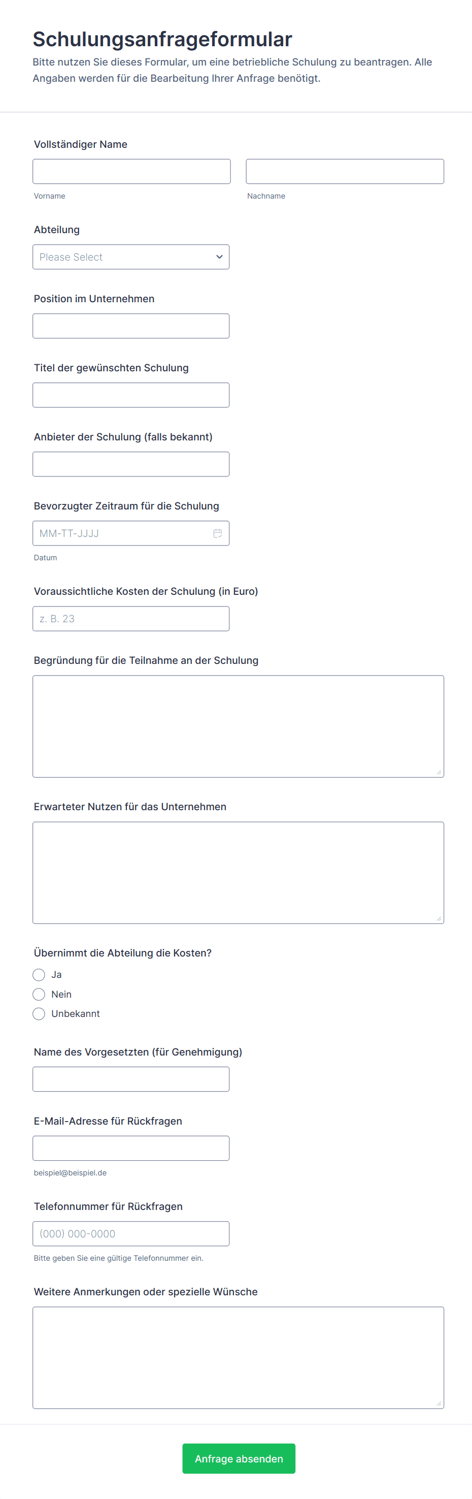 Schulungsformulare sind spezielle digitale Dokumente, die den Prozess der Organisation, Verwaltung und Bewertung von Schulungsprogrammen optimieren. Sie können für verschiedene Zwecke verwendet werden, beispielsweise für die Einarbeitung neuer Mitarbeiter, die Bewertung von Fähigkeiten, das Einholen von Feedback zu Schulungen, die Anmeldung zu Kursen, Umfragen vor Schulungen und Bewertungen nach Schulungen. Unternehmen jeder Größe — von Personalabteilungen bis hin zu Bildungseinrichtungen und Schulungsberatern — verlassen sich auf Schulungsformulare, um wichtige Informationen zu sammeln, den Fortschritt der Teilnehmenden zu verfolgen und sicherzustellen, dass die Lernziele effizient erreicht werden.