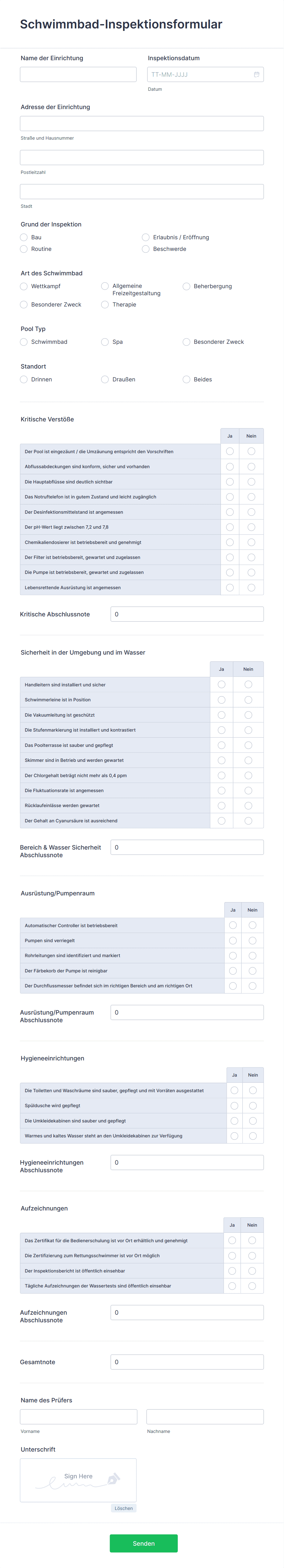 Prüfprotokolle sind spezielle Dokumente, die zur systematischen Bewertung, Erfassung und Meldung des Zustands, der Konformität oder der Qualität von Vermögenswerten, Umgebungen oder Prozessen verwendet werden. Sie sind in vielen Branchen unverzichtbar, darunter im Bauwesen, in der Fertigung, im Immobilienbereich, im Gastgewerbe, im Gesundheitswesen und im Transportwesen. Häufige Anwendungsbereiche sind Sicherheitsinspektionen, Geräteprüfungen, Begehungen von Immobilien, Fahrzeuginspektionen, Lebensmittelsicherheitsaudits und Überprüfungen der Anlagenwartung. Durch die Standardisierung des Inspektionsprozesses tragen diese Formulare dazu bei, dass alle erforderlichen Kriterien bewertet, Probleme dokumentiert und Korrekturmaßnahmen effizient nachverfolgt werden.