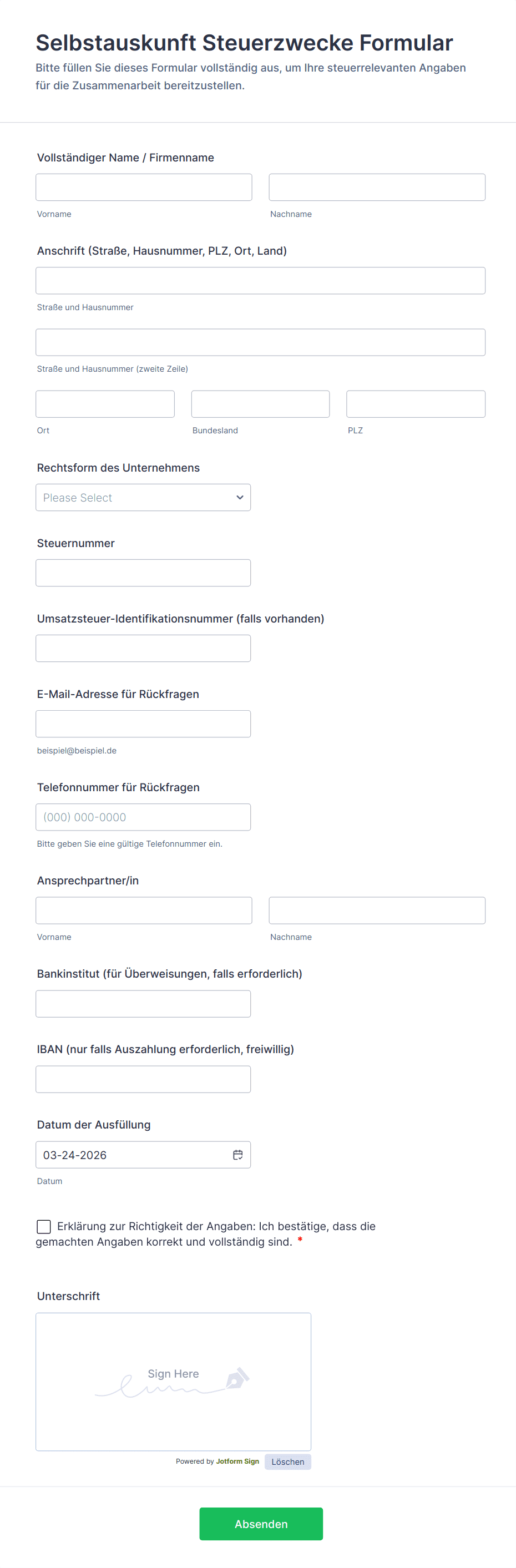 Ganz gleich, ob als Regierungsbehörde, die offizielle Steuerformulare sammelt, oder als Buchhalter, der Informationen von seinen Kunden einholt, mit den Steuerformularen von Jotform sammeln Sie Steuerinformationen sicher online! Wählen Sie zunächst eine der folgenden Formularvorlagen aus und passen Sie sie an Ihre Bedürfnisse und Ihr Branding an. Teilen Sie dann das Formular oder binden Sie es in Ihre Website ein, damit es auf jedem Smartphone, Tablet oder Computer ausgefüllt werden kann. Die Eingaben werden in Ihrem sicheren Jotform-Account gespeichert und können automatisch in professionelle PDF-Dokumente umgewandelt werden.