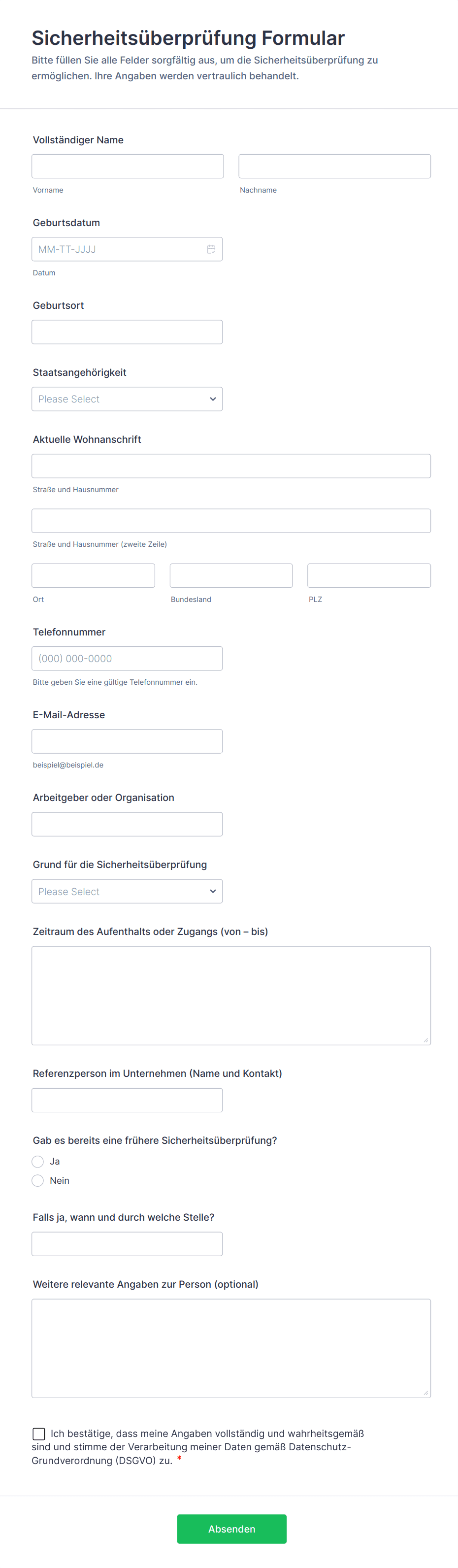 - Formulare für Besucher und temporären Zugang erfassen die Identität des Besuchers, Informationen zum Gastgeber, den Zweck des Besuchs, Datum und Uhrzeit des Eintritts sowie eventuelle Anforderungen zum Einchecken oder zur Begleitung.