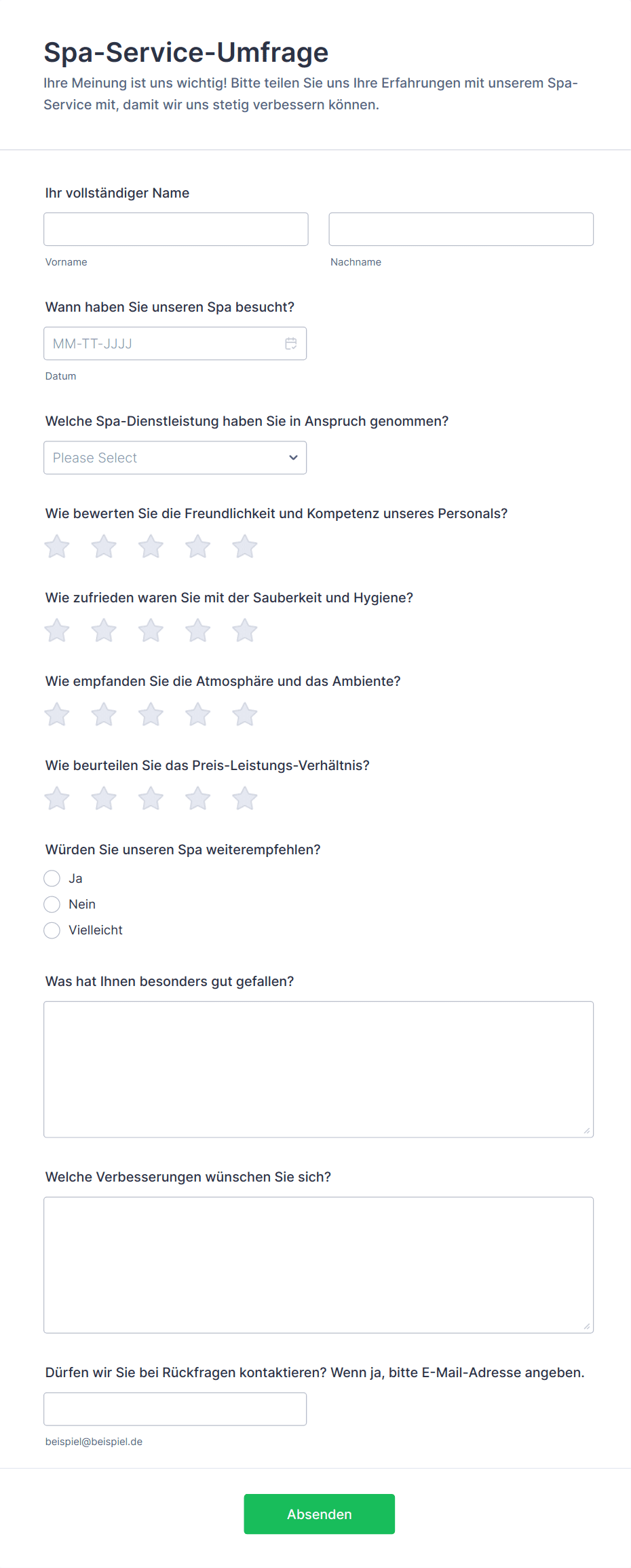 Ein Spa-Formular ist ein Online-Dokument, das von Spas und Wellnesszentren verwendet wird, um Informationen von Kunden zu erfassen, wie z. B. persönliche Daten, Terminwünsche, Gesundheitszustand, Einverständniserklärungen und Feedback.