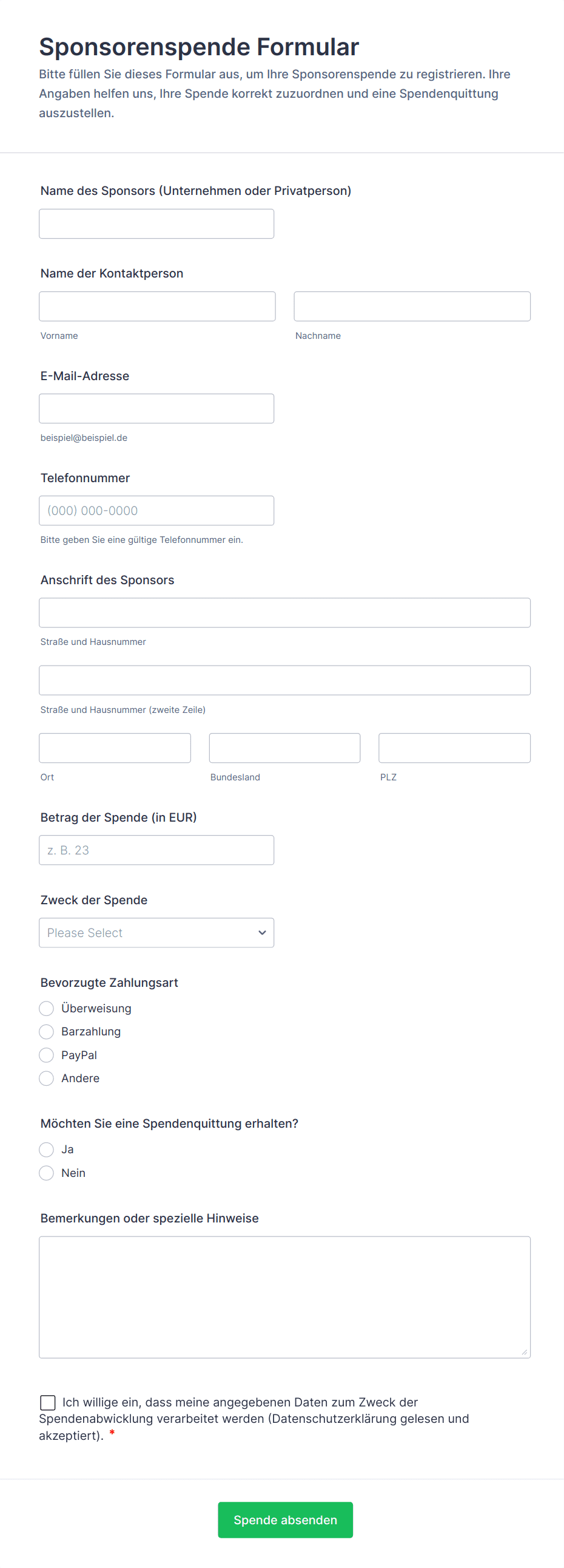 Spendenformulare sind spezielle Online-Formulare, mit denen Spenden für Wohltätigkeitsorganisationen, Spendenkampagnen, gemeinnützige Initiativen und Gemeinschaftsprojekte erfasst werden können. Sie optimieren den Prozess der Erfassung von Spenderinformationen, der Zahlungsabwicklung und der Nachverfolgung von Spenden und ermöglichen es Organisationen so, effizienter Spenden zu sammeln. Spendenformulare können für verschiedene Zwecke verwendet werden, beispielsweise für einmalige oder wiederkehrende Spenden, Event-Sponsoring, Crowdfunding-Aktionen, Mitgliederwerbung und Nothilfekampagnen. Sie sind ein unverzichtbares Tool für gemeinnützige Organisationen, Schulen, religiöse Gruppen und kommunale Einrichtungen, die Unterstützer gewinnen und ihren Spendern einen sicheren und bequemen Spendenprozess bieten möchten.