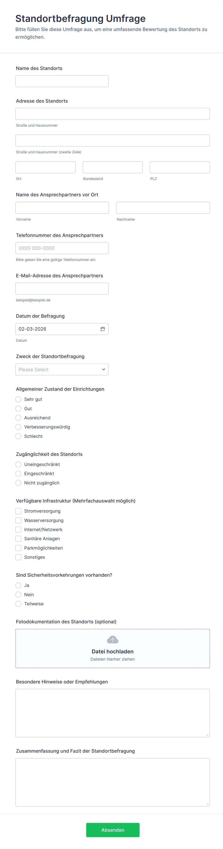 Ein Formular für eine Ortsbesichtigung ist ein Dokument, das von einem Vermessungsingenieur verwendet wird, um Notizen und Erkenntnisse während einer Ortsbesichtigung festzuhalten. Verwenden Sie das Formular für die Ortsbesichtigung, um wertvolle Informationen von Ihren Kunden während der Ortsbesichtigung und Inspektion zu erfassen. Bitten Sie Ihre Kunden einfach, das Formular vor oder nach der Inspektion auszufüllen und verfolgen Sie ihre Antworten online an einem sicheren Ort - dies ist ideal für jedes Unternehmen, das Informationen über einen Standort für spätere Referenzen erfassen muss.Bevor Sie Ihren Kunden ein Papierformular aushändigen, können Sie das Formular auf jedem beliebigen Gerät in der Vorschau anzeigen - und sogar verschiedene Fragen farblich kennzeichnen, um sie während der Inspektion leicht überprüfen zu können. Wenn Sie das Formular noch nützlicher machen möchten, fügen Sie einfach Ihr Logo hinzu und integrieren Sie es in Ihre anderen Konten - über 100 Plattformen stehen zur Auswahl. Verfolgen Sie Ihre Inspektionen, halten Sie die Daten Ihrer Kunden geheim und senden Sie die erfassten Antworten mit einem kostenlosen Online-Formular für Standortinspektionen an den Speicherdienst Ihrer Wahl.