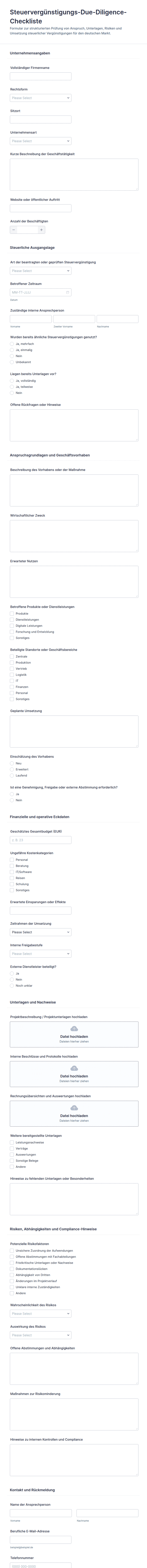 Checklistenformulare enthalten normalerweise eine Liste von Aufgaben oder Elementen, Checkboxen zur Bestätigung und können Felder für Namen, Daten, Kommentare, Unterschriften oder unterstützende Dokumentation beinhalten.