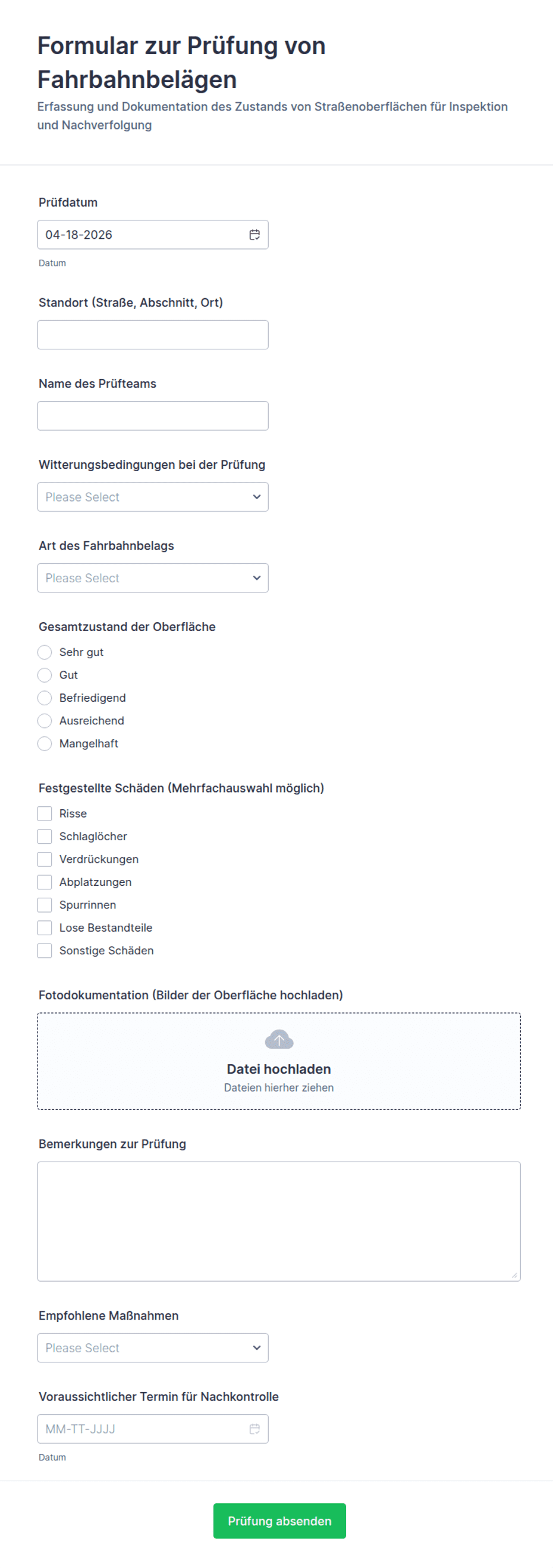 - Umweltinspektionen: Benötigen möglicherweise GPS-Standortfelder, Dropdown-Menüs für den Compliance-Status und Datei-Upload-Optionen für Belege.
