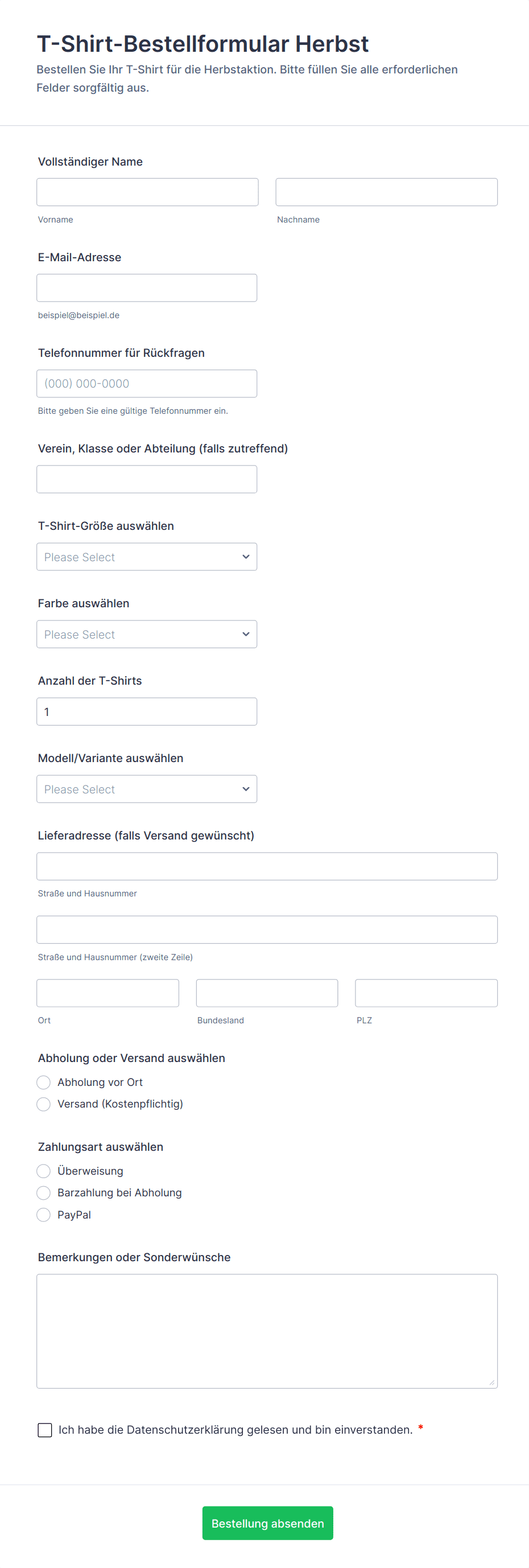 T-Shirt Bestellformulare sind spezielle Online-Formulare, die den Prozess der Bestellungserfassung für individuelle T-Shirts vereinfachen. Sie werden häufig von Unternehmen, Schulen, Sportteams, Eventveranstaltern und Fundraising-Gruppen verwendet, um wichtige Informationen wie Größen, Farben, Mengen und Personalisierungsdetails von Kunden oder Teilnehmern zu erfassen. Egal, ob Sie Merchandise-Artikel verkaufen, Team-Uniformen bestellen oder eine Spendenaktion durchführen: T-Shirt Bestellformulare helfen dabei, den Bestellprozess zu zentralisieren und zu vereinfachen, manuelle Fehler zu reduzieren und sicherzustellen, dass alle notwendigen Details effizient erfasst werden.