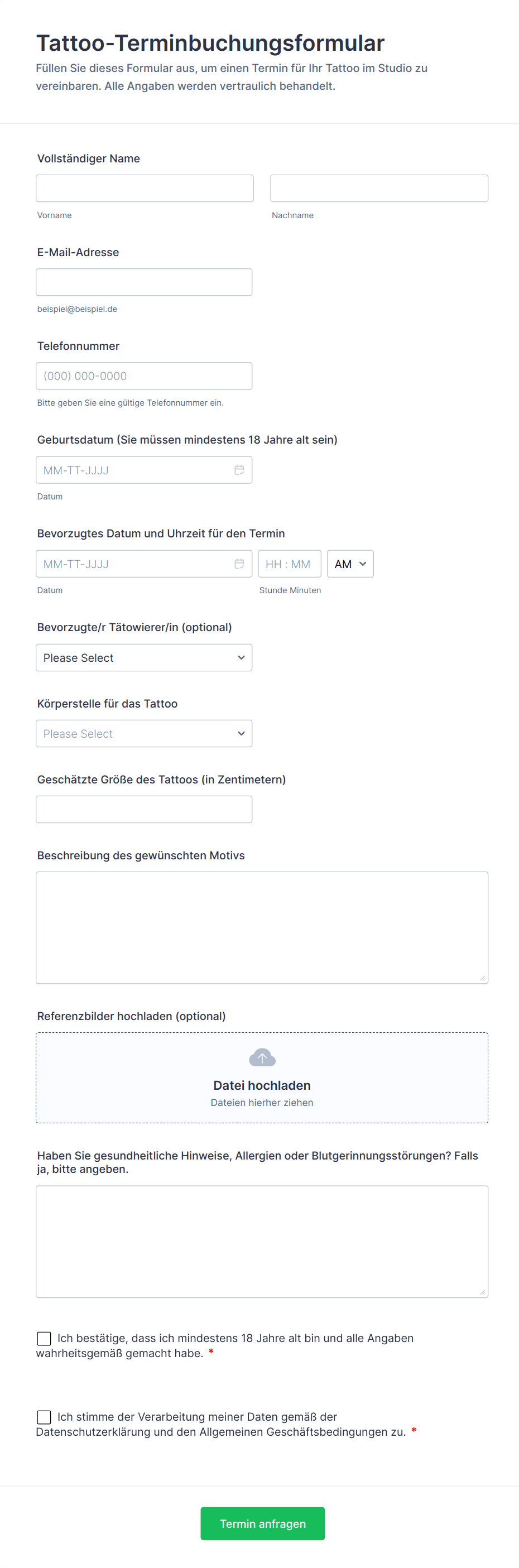Ein Tattoo-Terminbuchungsformular wird verwendet, um Terminanfragen für Tattoos online zu sammeln und alle wichtigen Angaben für die Planung gebündelt zu erhalten, etwa Kontaktdaten, Wunschtermin und eine kurze Motivbeschreibung.