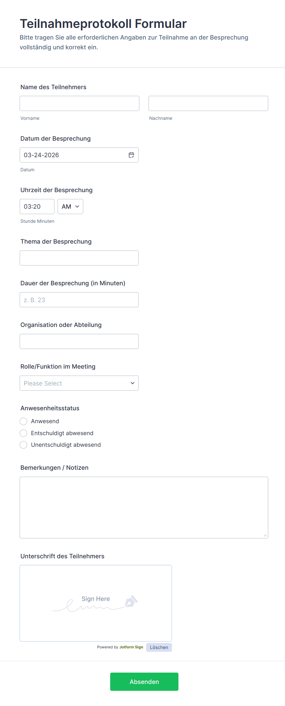 Ein Anwesenheitsformular ist ein digitales oder papierbasiertes Tool, das verwendet wird, um die Anwesenheit oder Abwesenheit von Personen bei einer Veranstaltung, einem Kurs, einem Meeting oder am Arbeitsplatz zu erfassen.