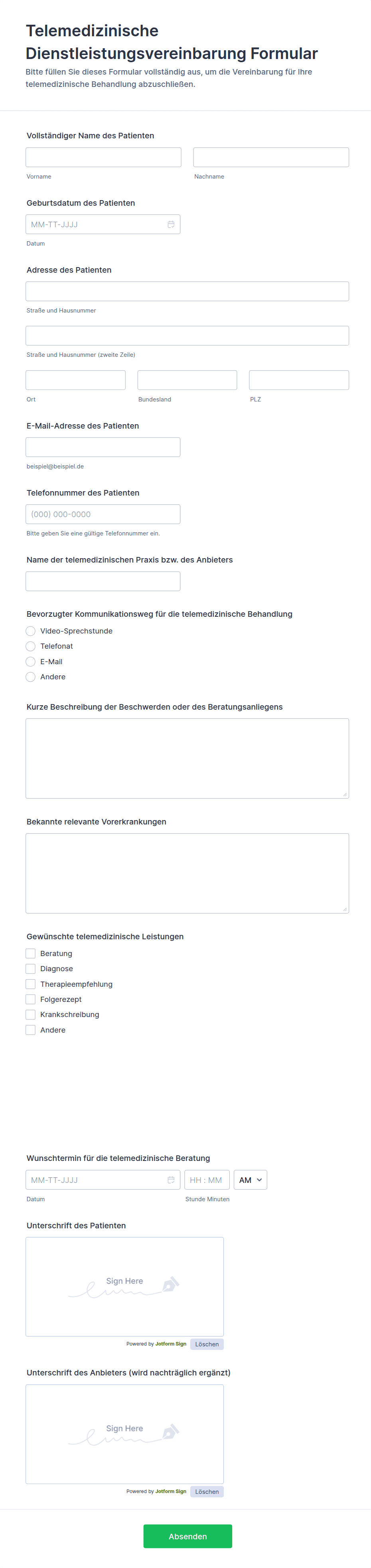 Mit Jotform erstellen und verwalten Sie Einverständniserklärungen mühelos. Gestalten Sie mit dem No-Code-Formulargenerator individuelle Erklärungen für Patientenaufnahme, elterliche Einwilligungen oder Datenverarbeitungsvereinbarungen. Die Drag-and-Drop-Oberfläche, anpassbare Vorlagen und Integrationen mit sicheren Speicher- und Benachrichtigungssystemen ermöglichen Ihnen, Einwilligungsantworten einfach zu erfassen, zu organisieren und abzurufen. Nutzen Sie erweiterte Funktionen, um Compliance sicherzustellen, Workflows zu optimieren und Unternehmen sowie Befragten ein professionelles Erlebnis zu bieten.