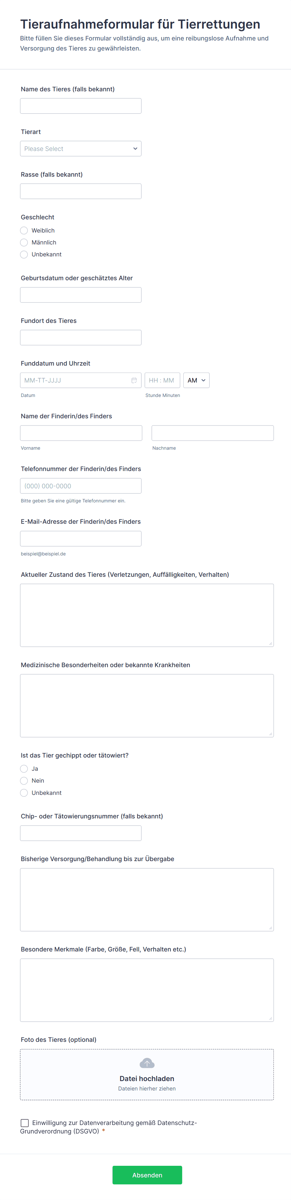 Ein Tierrettungsantragsformular ist ein digitales Formular, das von Tierheimen und Rettungsorganisationen verwendet wird, um Informationen von Personen zu sammeln, die an der Adoption, Pflege, ehrenamtlichen Mitarbeit oder Abgabe von Tieren interessiert sind.
