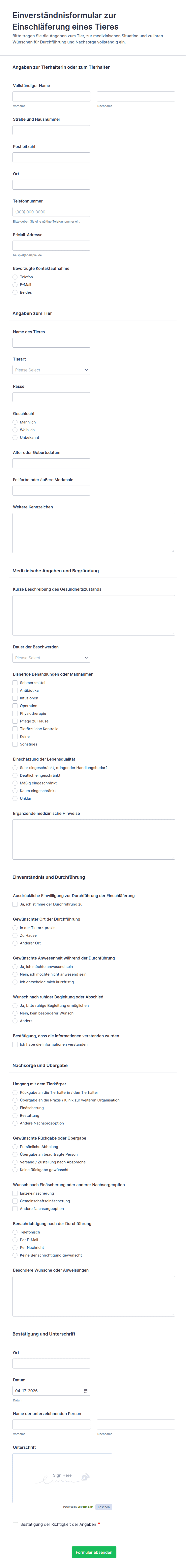 - Für medizinische oder Forschungsformulare sollten Abschnitte für bestimmte Verfahren, Widerrufsrechte und Datenschutzhinweise enthalten sein.