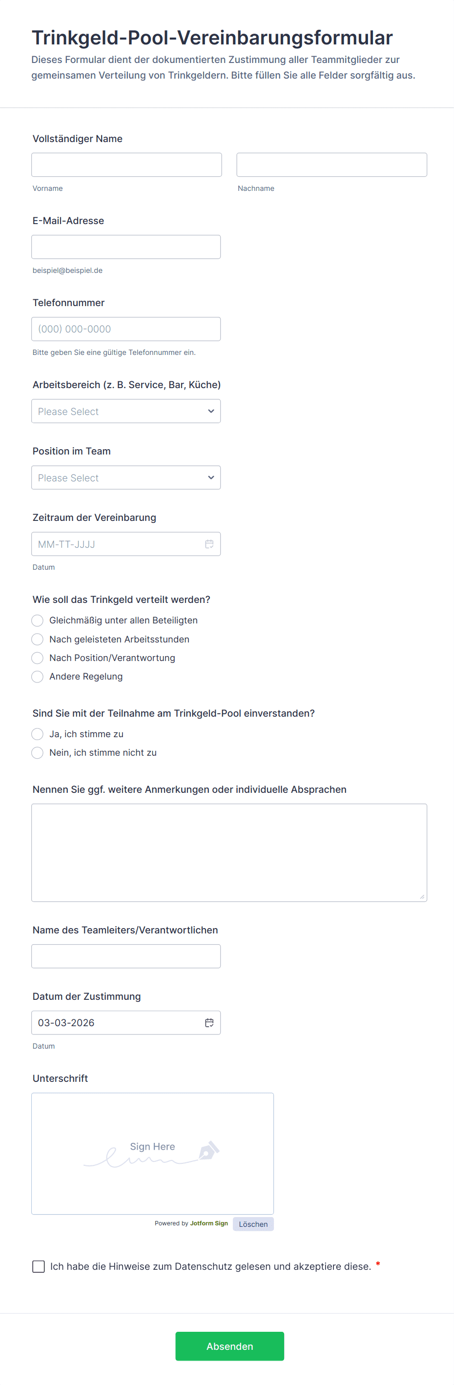 Mit einem Formular zur Mitarbeiterverfügbarkeit können diese ihre verfügbaren Stunden an Vorgesetzte, Manager oder Arbeitgeber übermitteln. Mit unserem kostenlosen Online-Formular für die Verfügbarkeit von Mitarbeitern können Sie auf jedem Gerät nahtlos Verfügbarkeiten empfangen und die Zeitpläne Ihrer Mitarbeiter verwalten! Passen Sie einfach das Design der Formularvorlage an Ihr Unternehmen an, betten Sie es in eine Website ein oder geben Sie es über einen Link an Ihre Mitarbeiter weiter, und Sie erhalten im Handumdrehen Antworten. Alle Übermittlungen werden sicher in Ihrem Jotform-Konto gespeichert, so dass Sie sie auf jedem Gerät ansehen und mit Ihren Kollegen teilen können.   Diese kostenlose Vorlage für ein Formular zur Mitarbeiterverfügbarkeit enthält bereits alle Formularfelder, die Sie benötigen - wie Name, Abteilung, E-Mail-Adresse sowie Datums- und Zeitauswahl. Wenn Sie jedoch Ihr Firmenlogo hinzufügen, ein Widget für die elektronische Unterschrift einbinden oder mit über 100 beliebten Drittanbieter-Apps integrieren möchten, können Sie dies mit unserem Formulargenerator per Drag & Drop in wenigen Klicks erledigen. Ganz gleich, in welcher Branche Sie tätig sind, es ist wichtig, die Bedürfnisse Ihrer Mitarbeiter zu berücksichtigen - erfassen Sie deren Verfügbarkeit nahtlos online mit einem Formular zur Mitarbeiterverfügbarkeit!